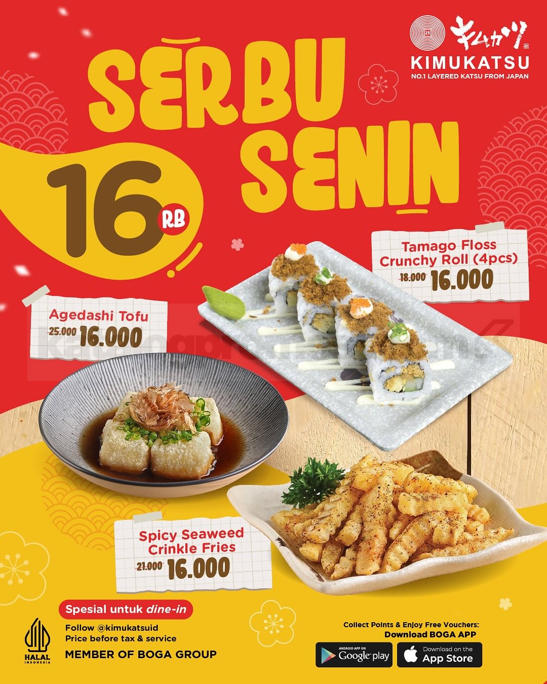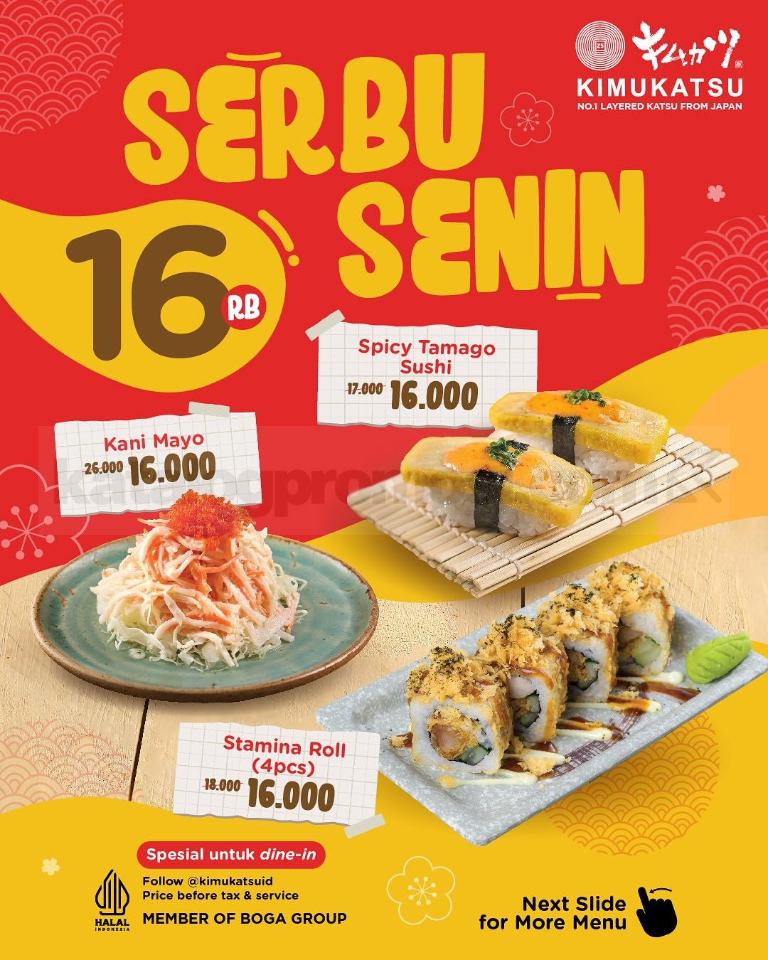 Promo Kimukatsu Serbu Senin hadir tiap Senin! Dapatkan menu favorit mulai Rp16.000. Spesial buat dine-in. Buruan sebelum kehabisan! 🍣🔥