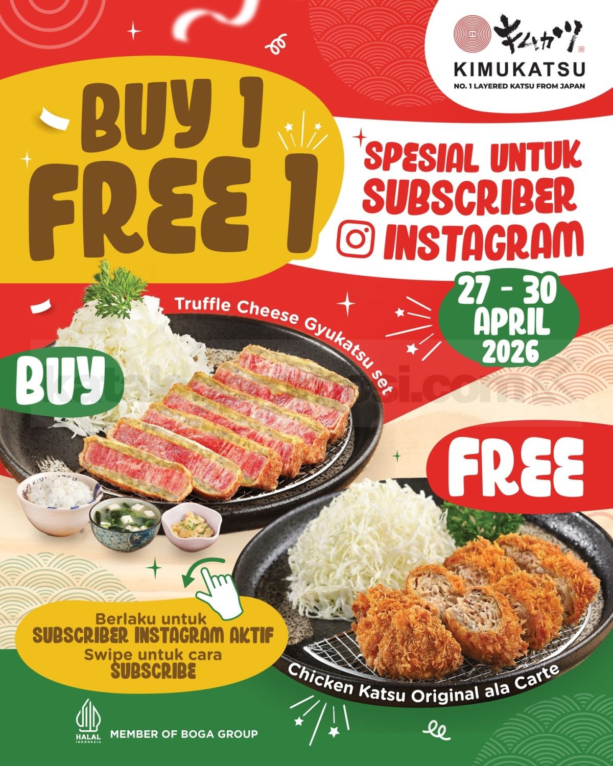 Promo Kimukatsu Spesial Subscriber Buy 1 Free 1 gratis Chicken Katsu Original Ala Carte dengan pembelian Truffle Cheese Gyukatsu berlaku 27 April 2026 – 30 April 2026.