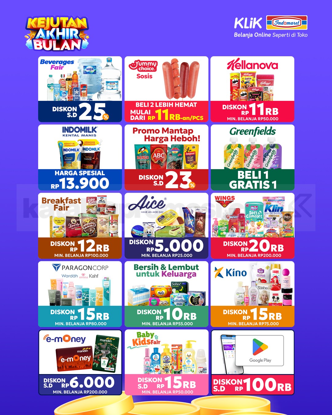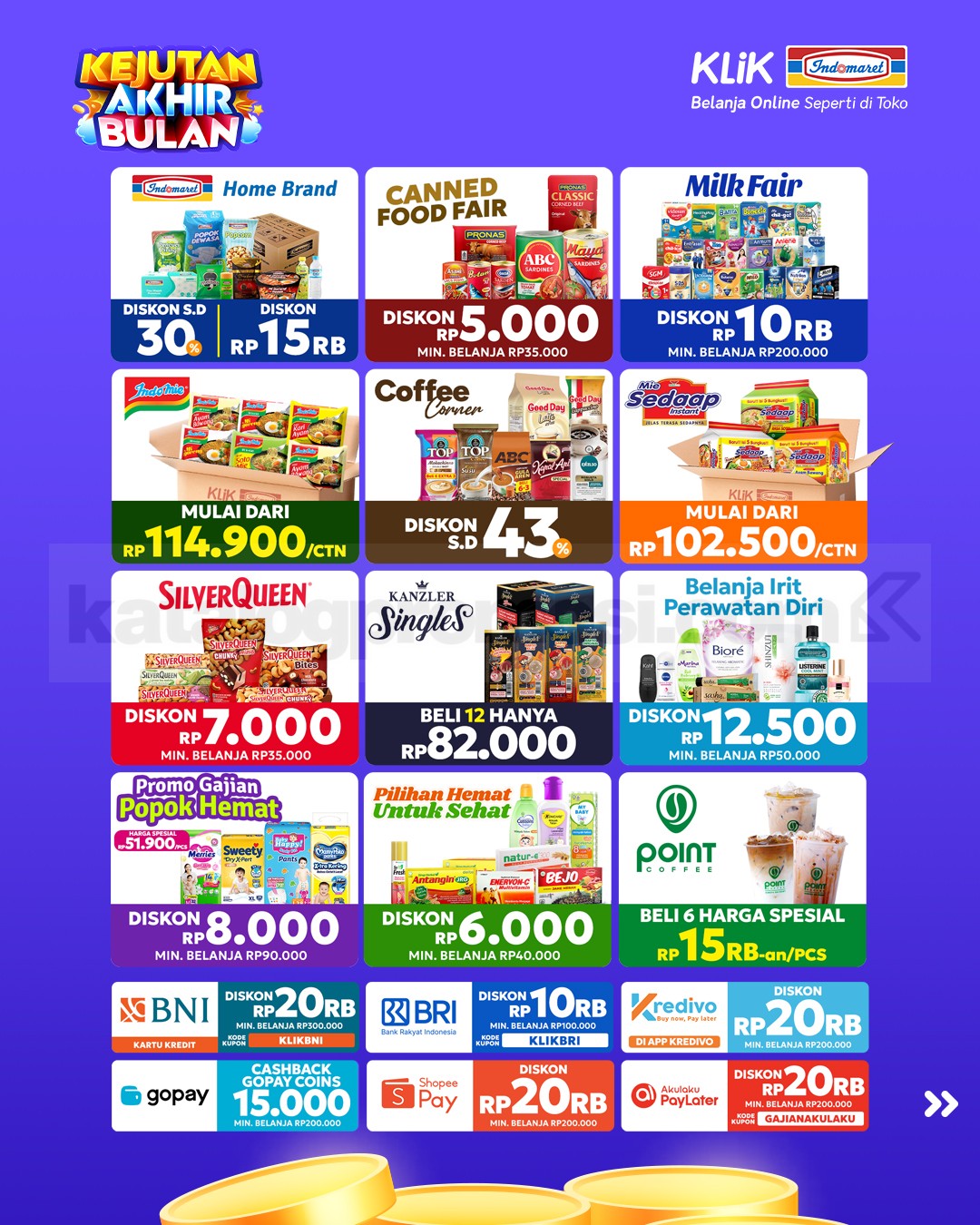 Benefit yang tersedia pada Promo Klik Indomaret Kejutan Akhir Bulan Diskon hingga 50% meliputi: