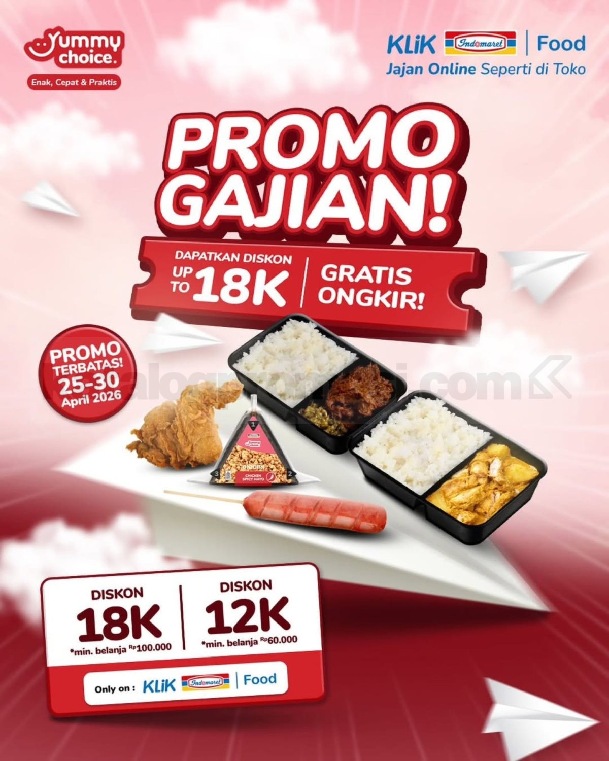 Diskon Rp.18.000 didapat saat total pembelian produk Yummy Choice mencapai minimum transaksi Rp.100.000 melalui aplikasi Klik Indomaret pada periode 25 – 30 April 2026.