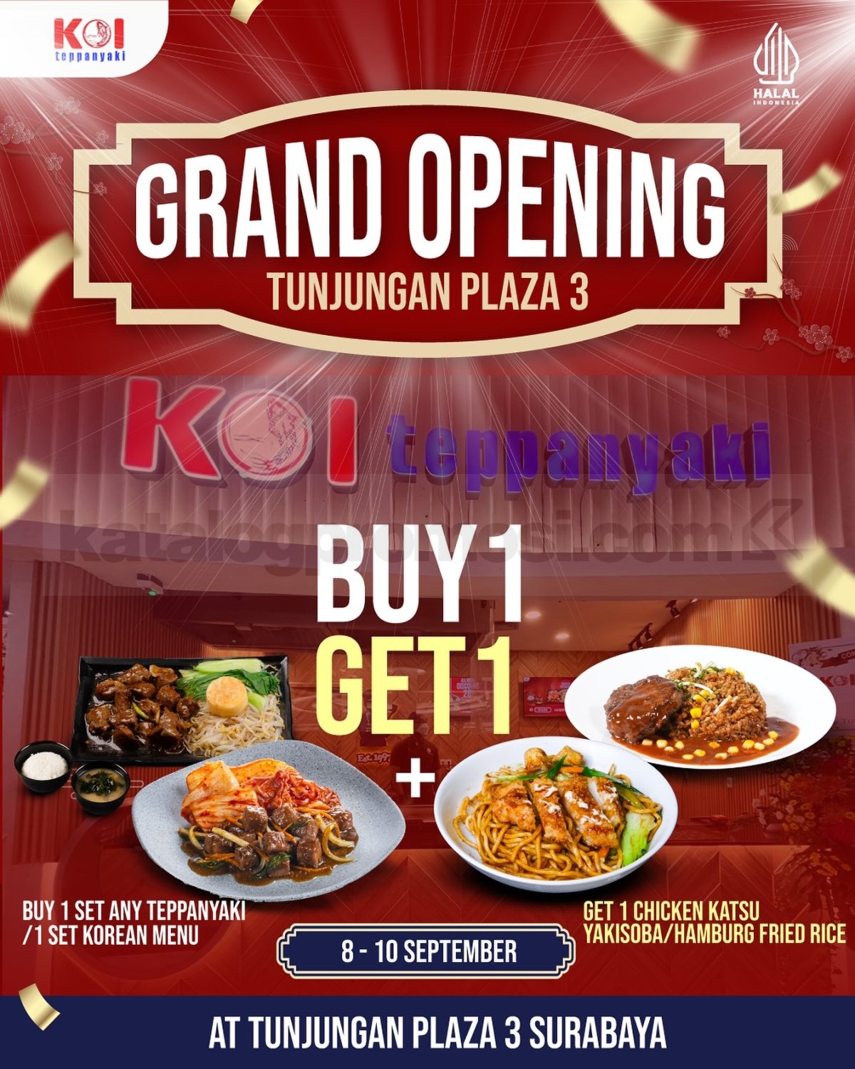 Promo KOI Teppanyaki Grand Opening Tunjungan Plaza Surabaya beli 1 teppan/korean menu gratis fried rice atau yakisoba berlaku 8โ10 September 2025.