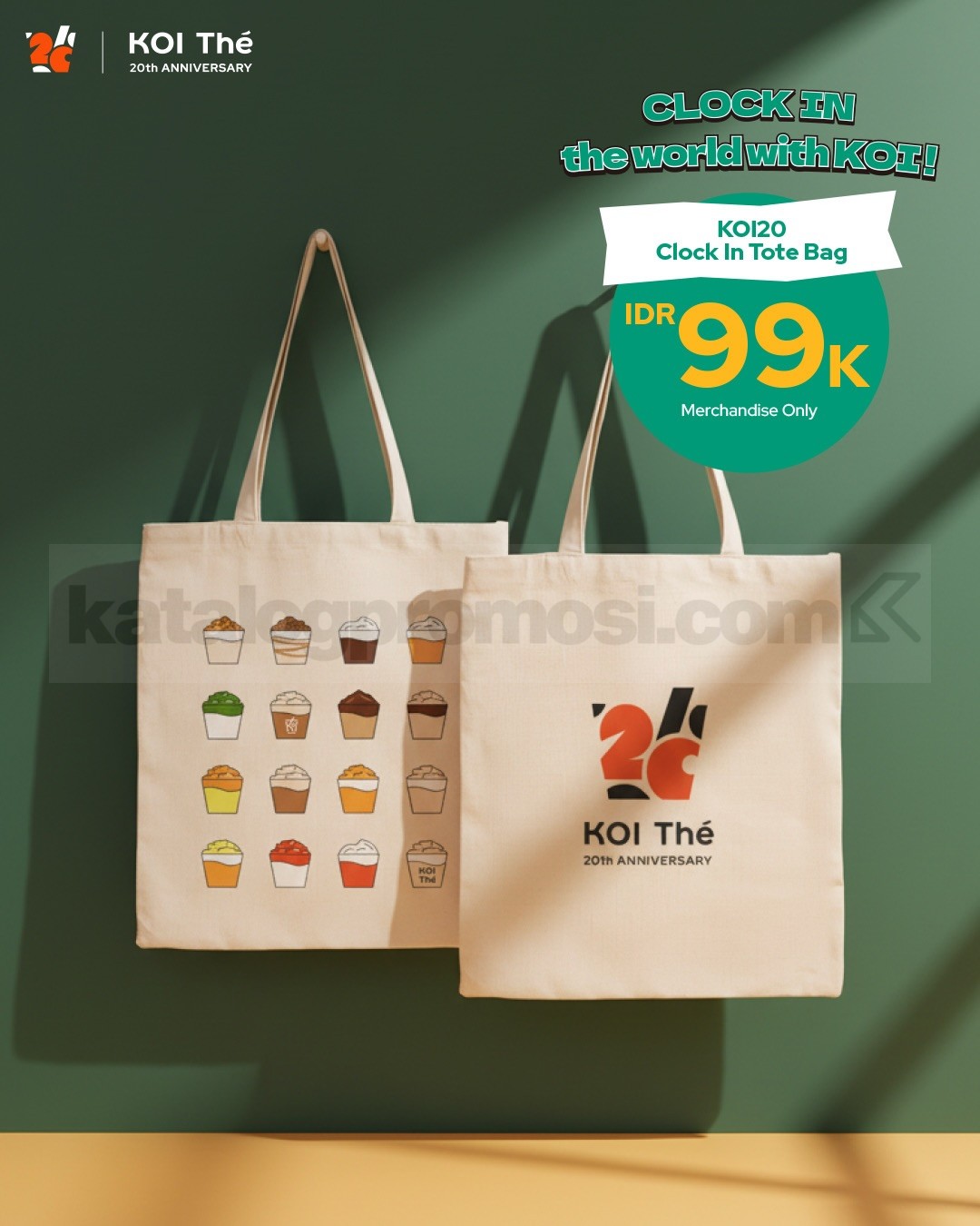 Promo KOI The KOI20 Clock In Tote Bag Rp. 99.000 merchandise anniversary tanpa minimum pembelian berlaku selama persediaan masih tersedia di seluruh outlet KOI.