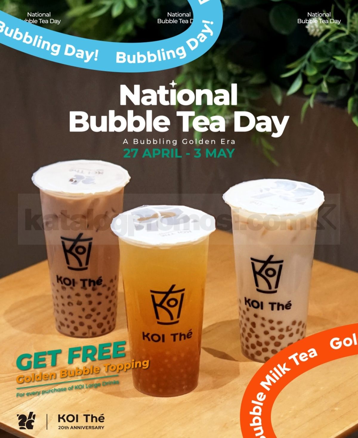 Promo KOI Thé National Bubble Tea Day Gratis Golden Bubble topping untuk pembelian minuman ukuran large berlaku 27 April 2026 – 3 Mei 2026 di seluruh outlet.