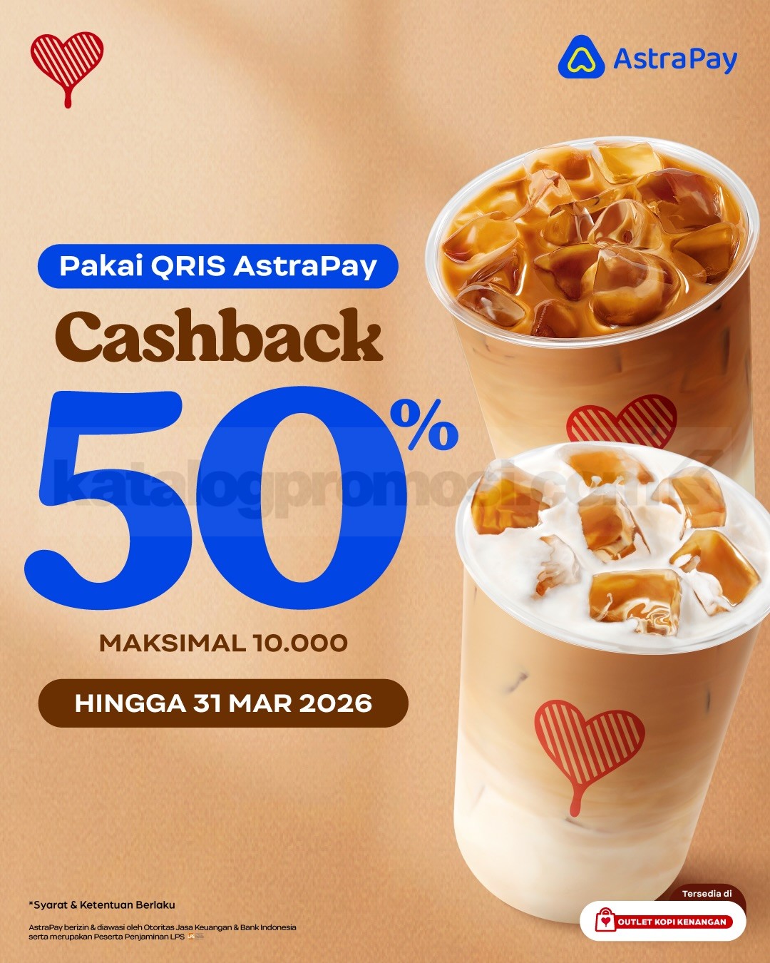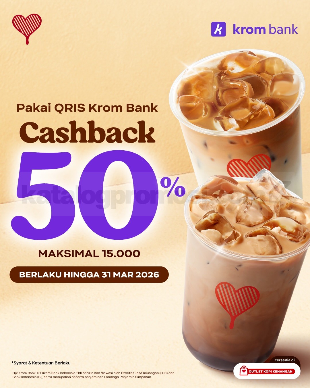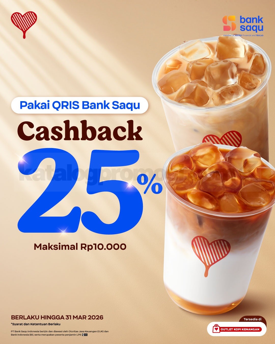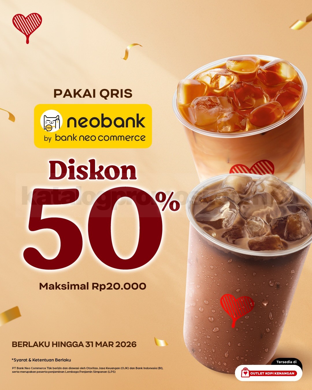 Promo Kopi Kenangan Bank Diskon & Cashback hingga 50% dengan pembayaran QRIS bank pilihan berlaku mulai tanggal 1 Januari 2026 – 30 Juni 2026 di seluruh outlet.