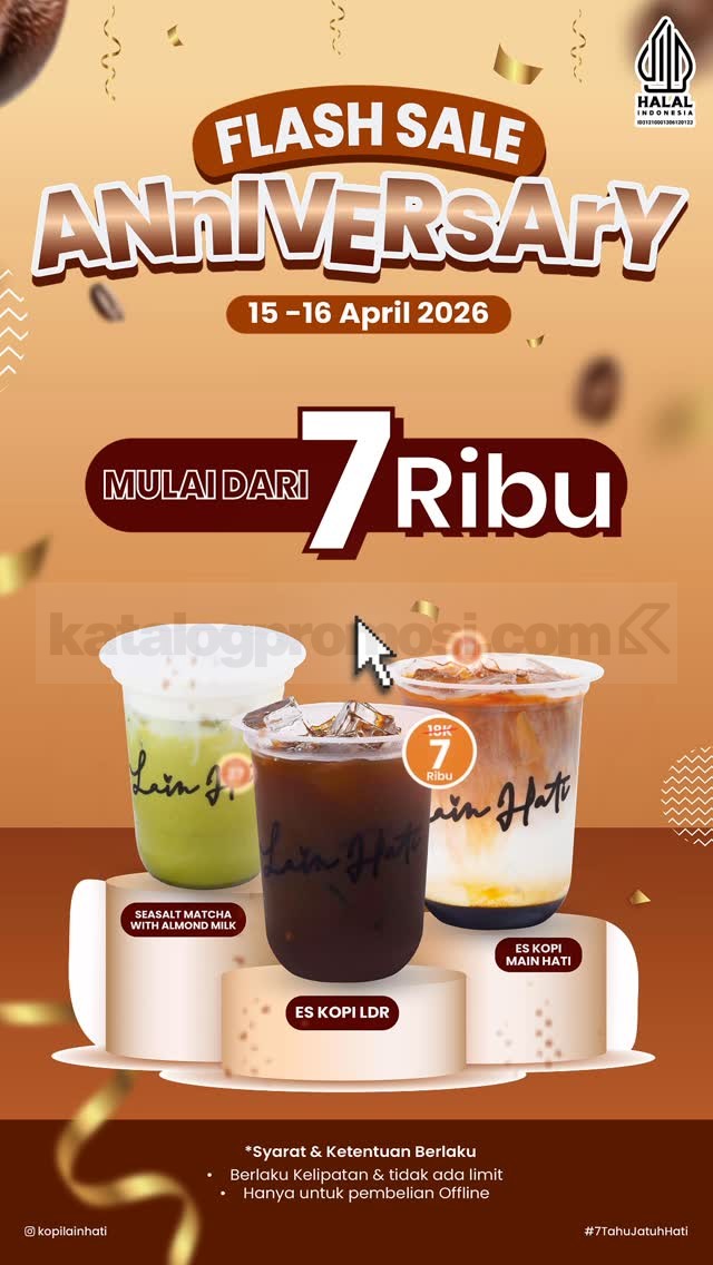 Promo Kopi Lain Hati Anniversary mulai Rp. 7.000 untuk berbagai menu favorit dengan pembelian dine in atau take away berlaku 15 April 2026 – 16 April 2026