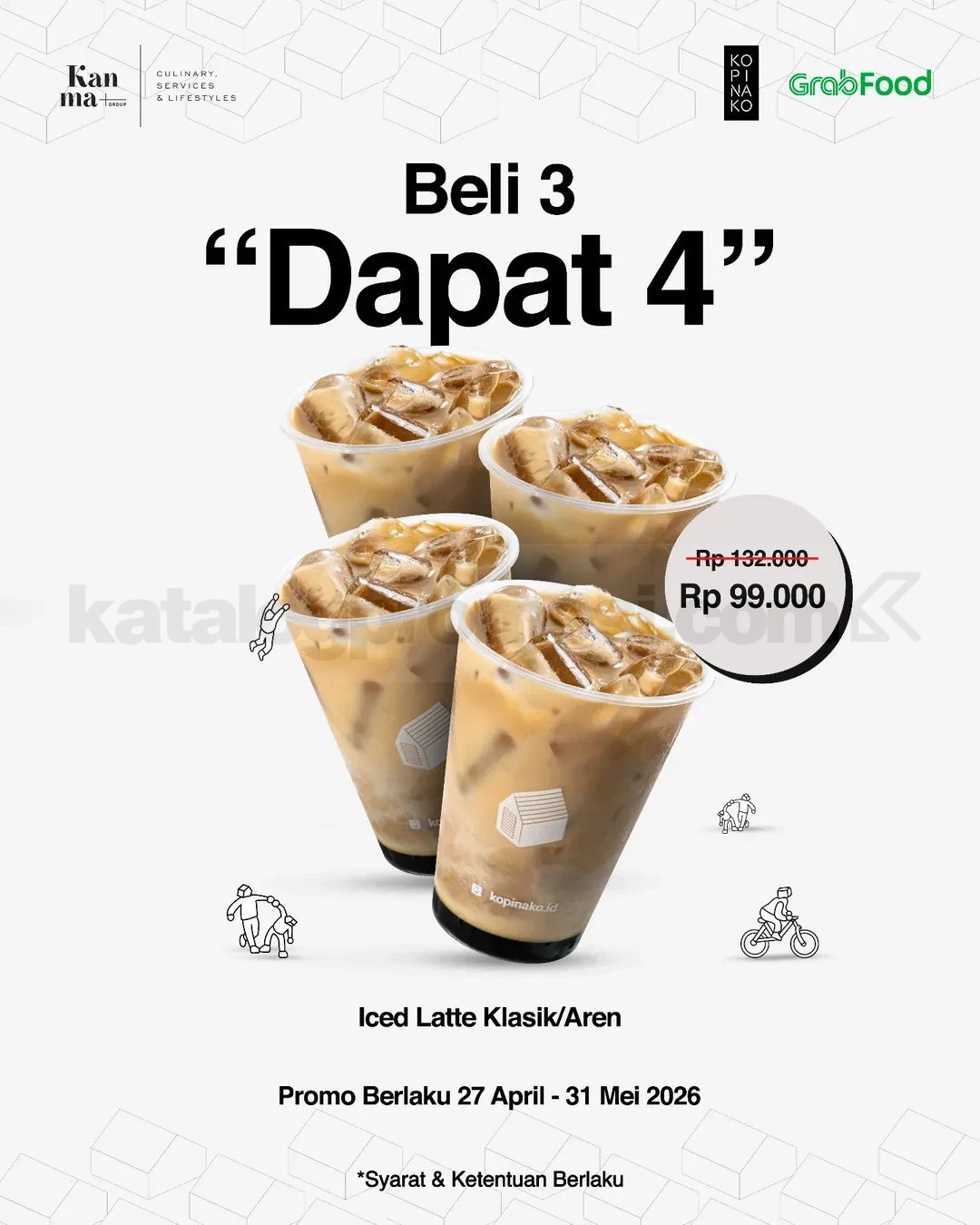 Promo Kopi Nako GrabFood Beli 3 Dapat 4 Rp. 99.000, bundling iced latte klasik atau aren berlaku mulai tanggal 27 April 2026 – 31 Mei 2026 via GrabFood