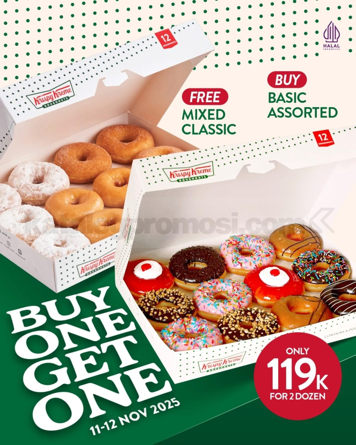 Promo Krispy Kreme 11.11 beli 1 gratis 1 dua lusin donat Rp. 119.000 berlaku 11–12 November 2025 di seluruh outlet kecuali bandara, untuk dine-in, takeaway, dan delivery.