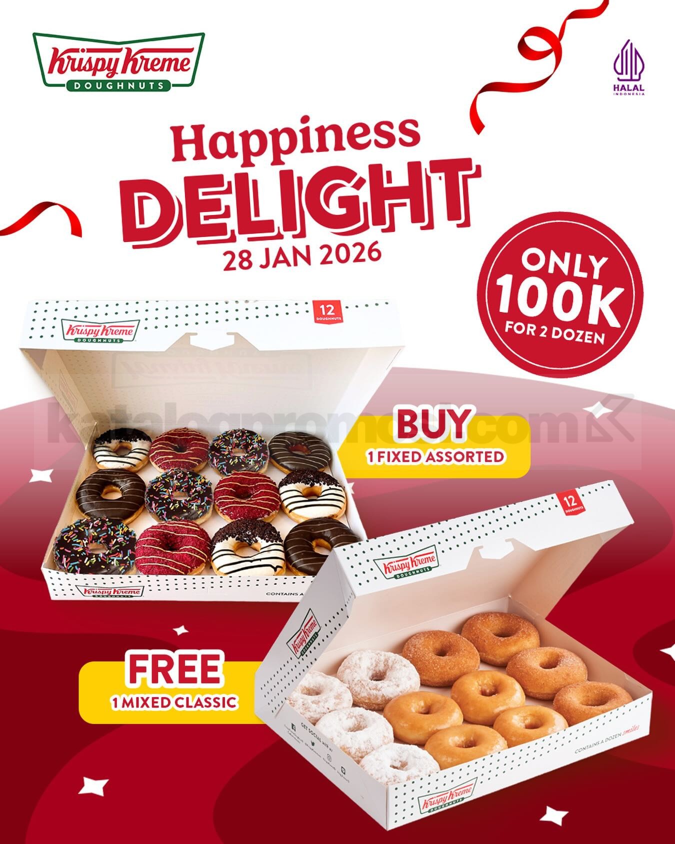 Promo Krispy Kreme Beli 1 Gratis 1 Dapat 2 Lusin cuma Rp. 100.000 berlaku hanya di tanggal 28 Januari 2026 untuk pembelian langsung dan delivery GoFood serta GrabFood di store tertentu.