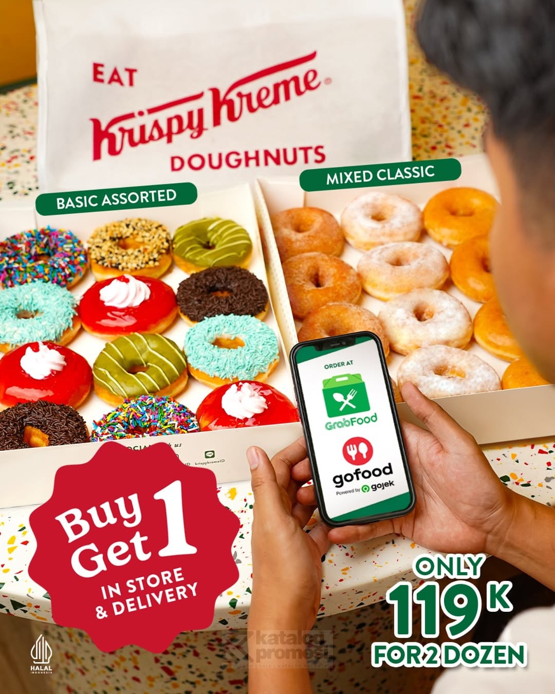 👉 Cek gambar promo Krispy Kreme Buy 1 Get 1 Free di bawah ini untuk lihat paket dua lusin dan info lengkap masa berlakunya.