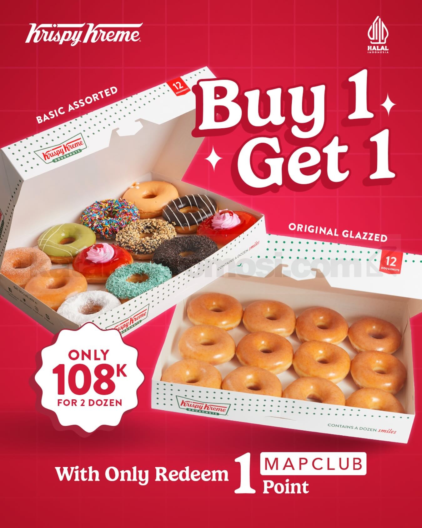 Mau ngemil manis tapi tetap hemat? Tenang, ada Promo Krispy Kreme Buy 1 Get 1 yang super menggoda! đ Cuma dengan tukar 1 poin MAPCLUB, kamu bisa bawa pulang 2 lusin donat favorit semua orang (1 lusin Original Glazed + 1 lusin Basic Assorted) cuma dengan Rp108.000!
