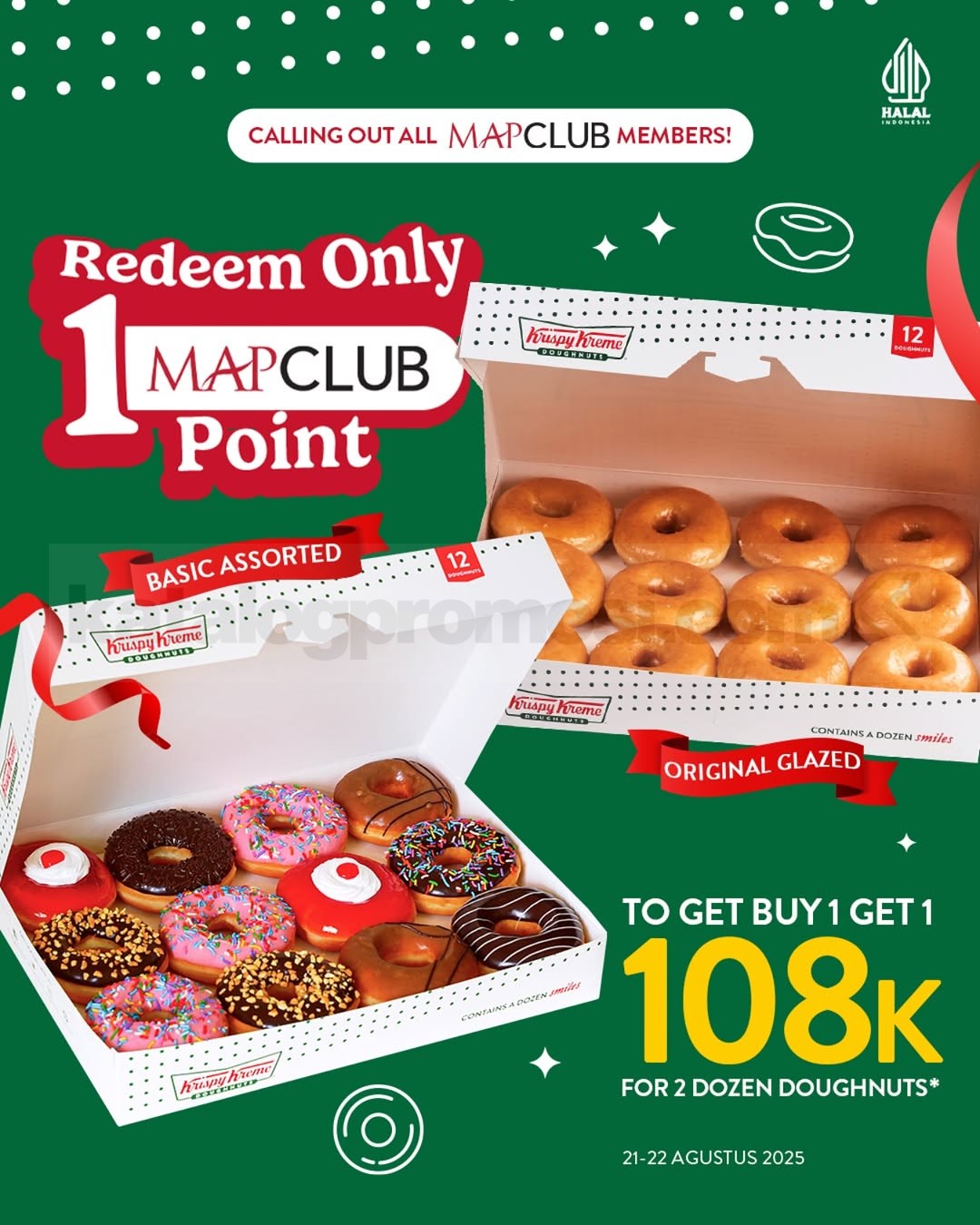 Promo Krispy Kreme Buy 1 Get 1 cuma tukar 1 poin MAPCLUB, bisa dapet 2 lusin donat seharga 108K! Berlaku tanggal 21-22 Agustus 2025