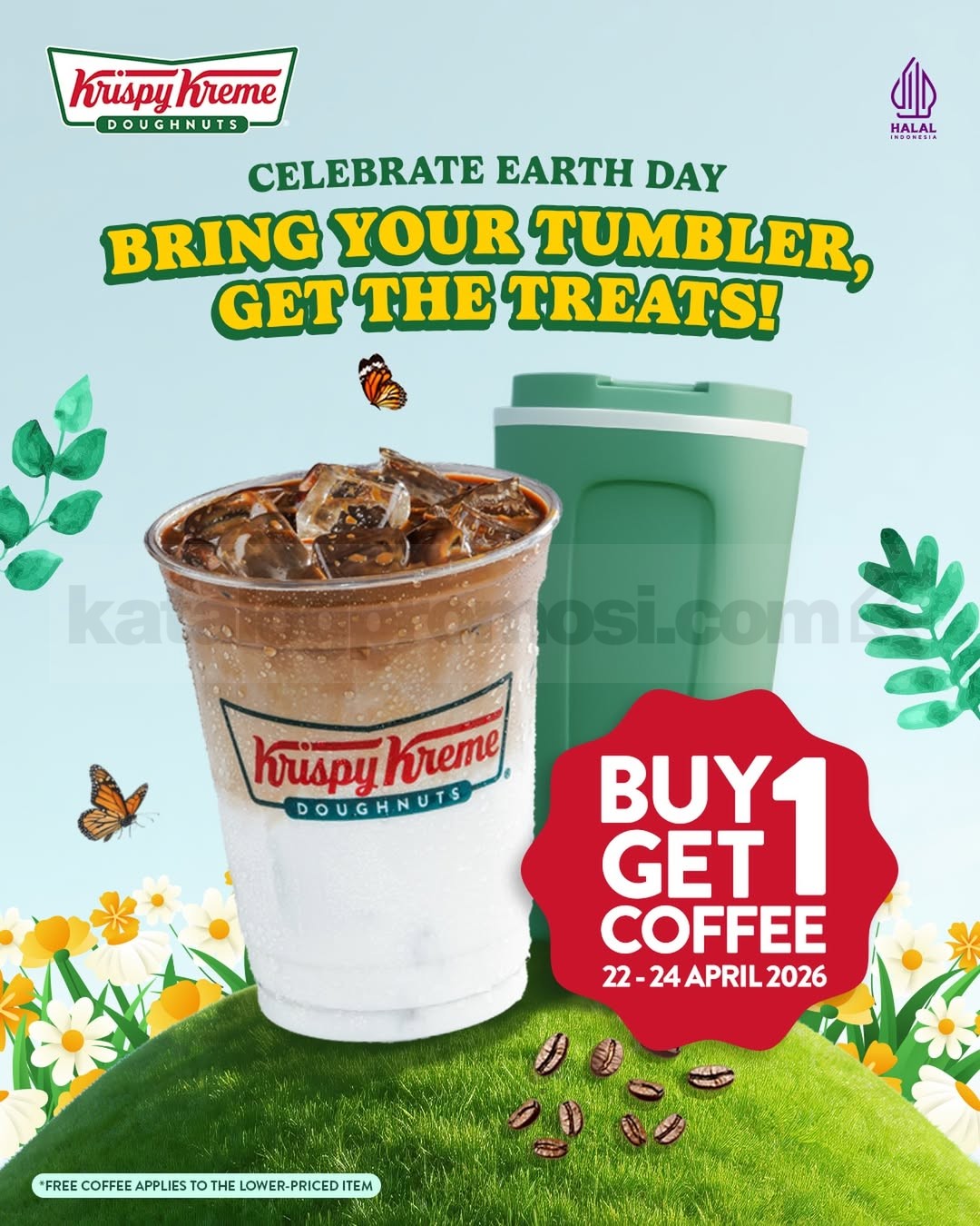 Promo Krispy Kreme Earth Day Buy 1 Get 1 Coffee bawa tumbler sendiri nikmati kopi gratis berlaku 22 April 2026 – 24 April 2026