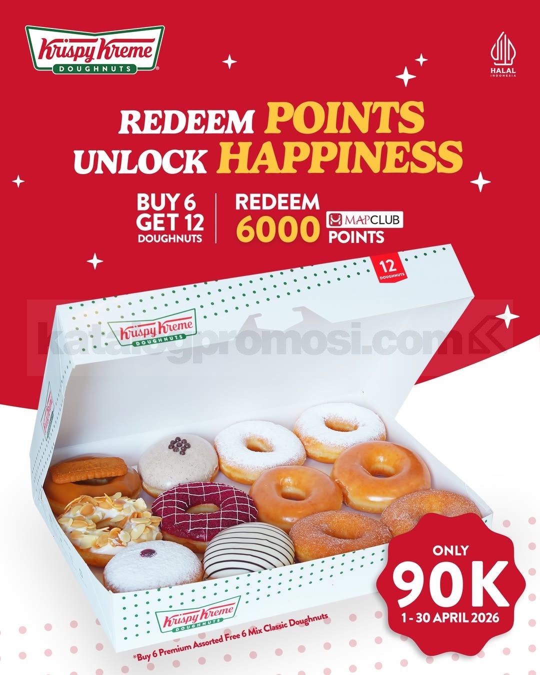 Promo Krispy Kreme MAPCLUB Beli 6 Gratis 6 Doughnuts Rp. 90.000 dengan redeem 6.000 poin berlaku mulai tanggal 1 April 2026 – 30 April 2026 di seluruh outlet