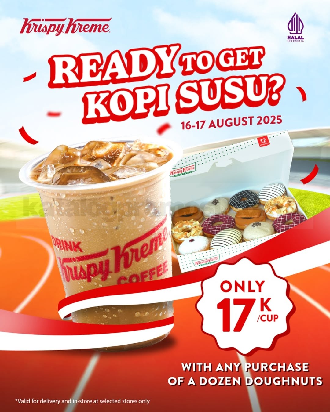 Promo Krispy Kreme Spesial Kemerdekaan hadir tanggal 16–17 Agustus 2025. Nikmati Kopi Susu cuma 17 ribu setiap beli 1 lusin donat.