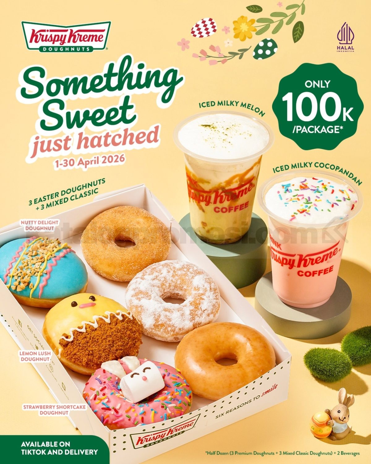 Promo Krispy Kreme Spring Package Rp. 100.000 berisi 6 donat dan 2 minuman, berlaku mulai tanggal 1 April 2026 – 30 April 2026 di lokasi tertentu.