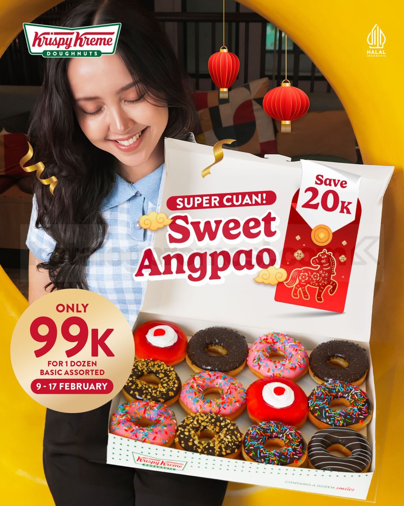 Promo Krispy Kreme Sweet Angpao Diskon Rp. 20.000 untuk 1 Dozen Basic Assorted jadi Rp. 99.000 dengan ucap Gong Xi di kasir berlaku mulai tanggal 9-17 Februari 2026 di seluruh outlet.