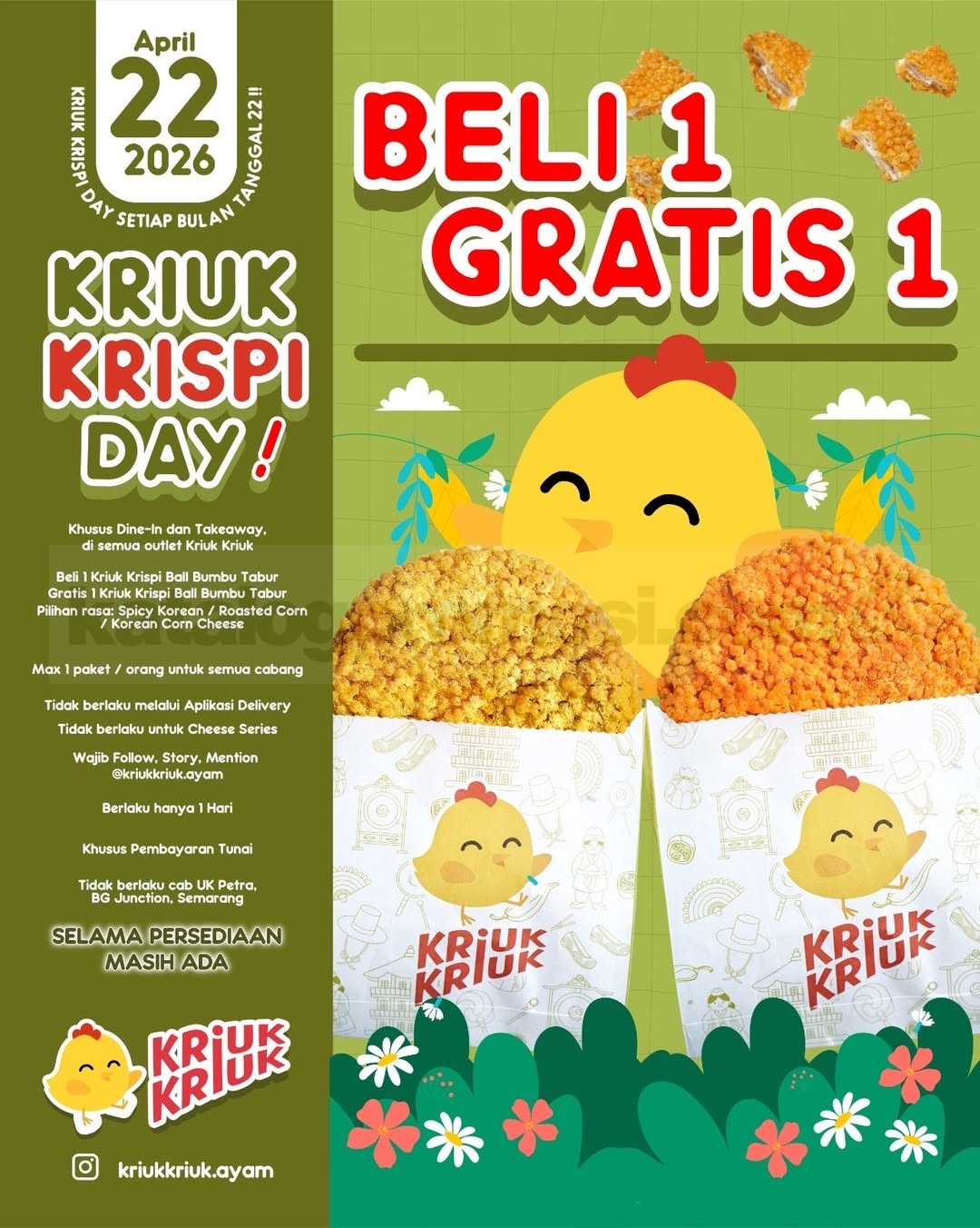 Di tanggal 22 April 2026, kamu bisa menikmati sensasi crispy dari Kriuk Krispi Ball dengan promo beli 1 gratis 1. Menariknya lagi, gratisannya adalah varian rasa baru yang lagi hype dan wajib dicoba bareng bestie kamu 😍