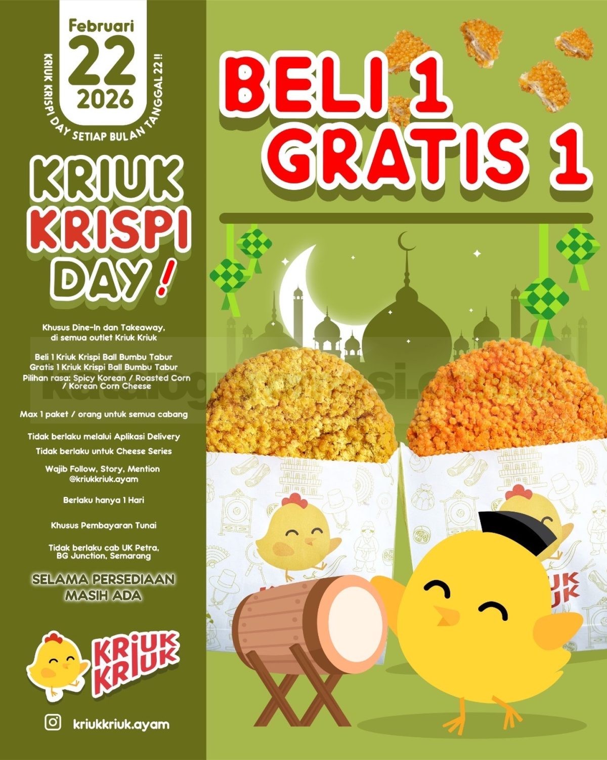 Beli 1 GRATIS 1 Kriuk Krispi Ball berlaku khusus tanggal 22 Februari 2026. Dalam program ini, setiap pembelian 1 Kriuk Krispi Ball akan mendapatkan 1 Kriuk Krispi Ball rasa baru tanpa biaya tambahan.