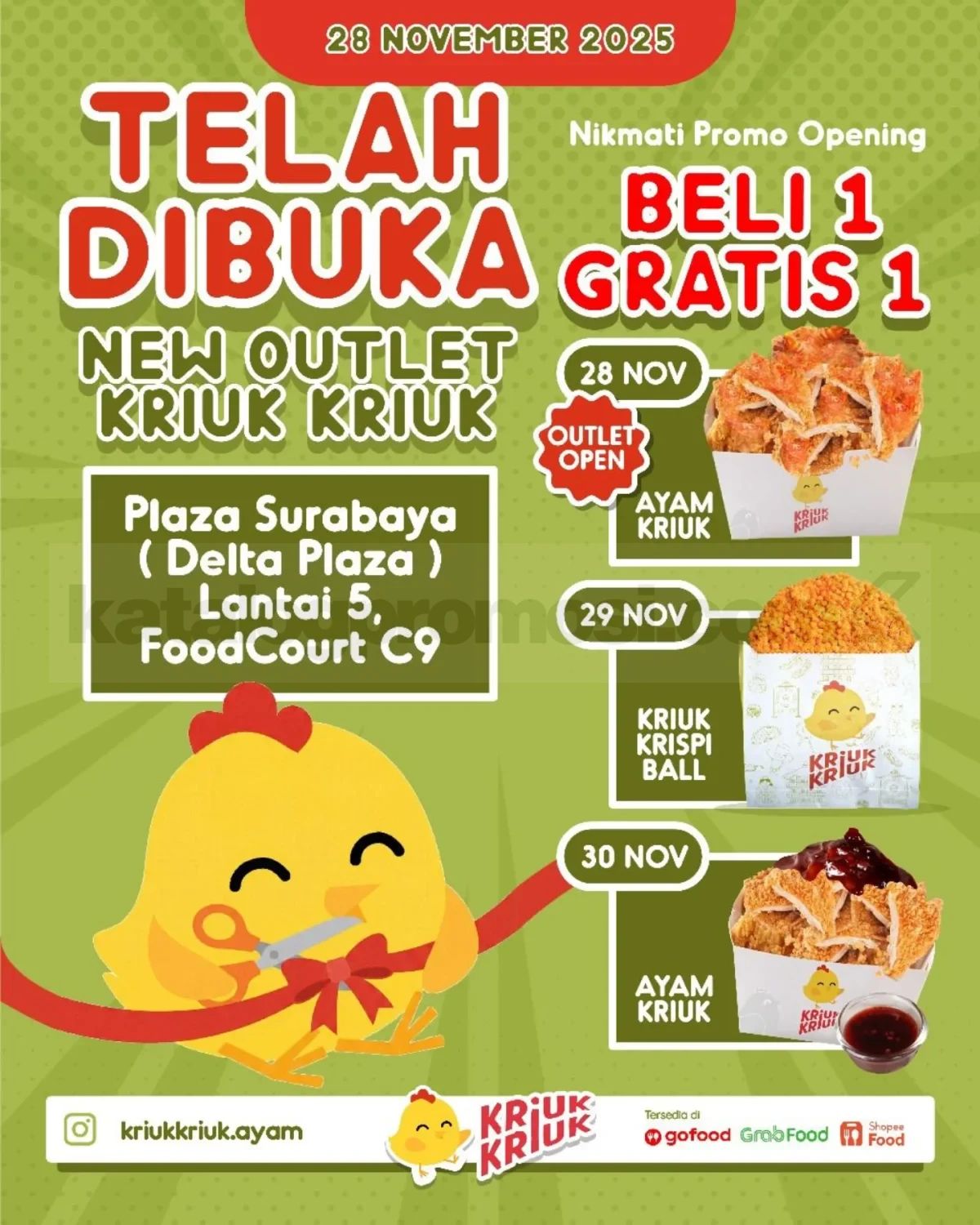 👉 Cek gambar Promo Kriuk Kriuk Opening Surabaya Beli 1 Gratis 1 di bawah ini untuk lihat detail promonya!