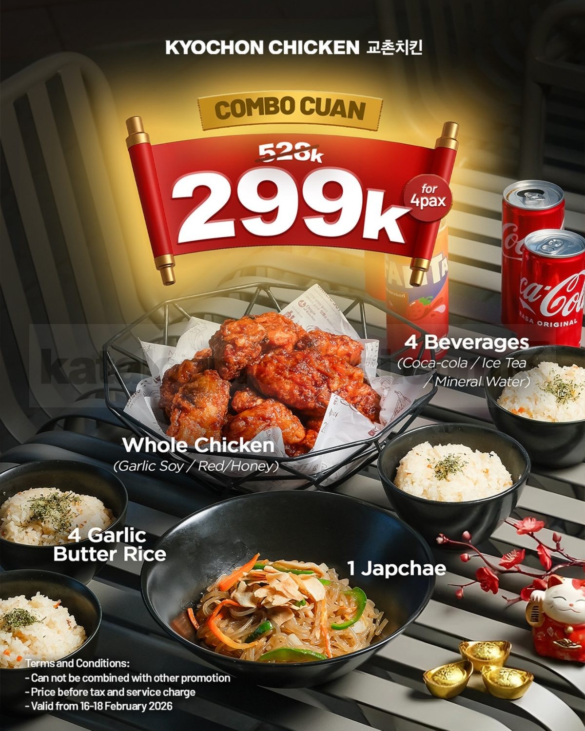Promo Kyochon Chicken Combo Cuan Rp. 299.000 paket sharing 4 pax dengan whole chicken, japchae, butter rice, dan minuman berlaku mulai tanggal 16-18 Februari 2026.