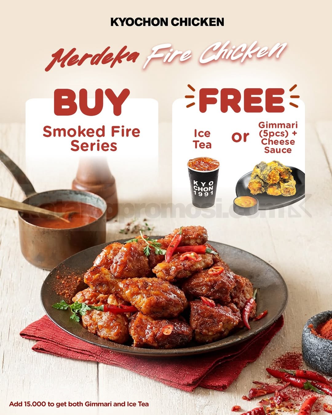 Promo Kyochon Merdeka beli Smoked Fire Chicken Series gratis ice tea atau gimmari 5 pcs + cheese sauce! Berlaku 11–20 Agustus 2025.