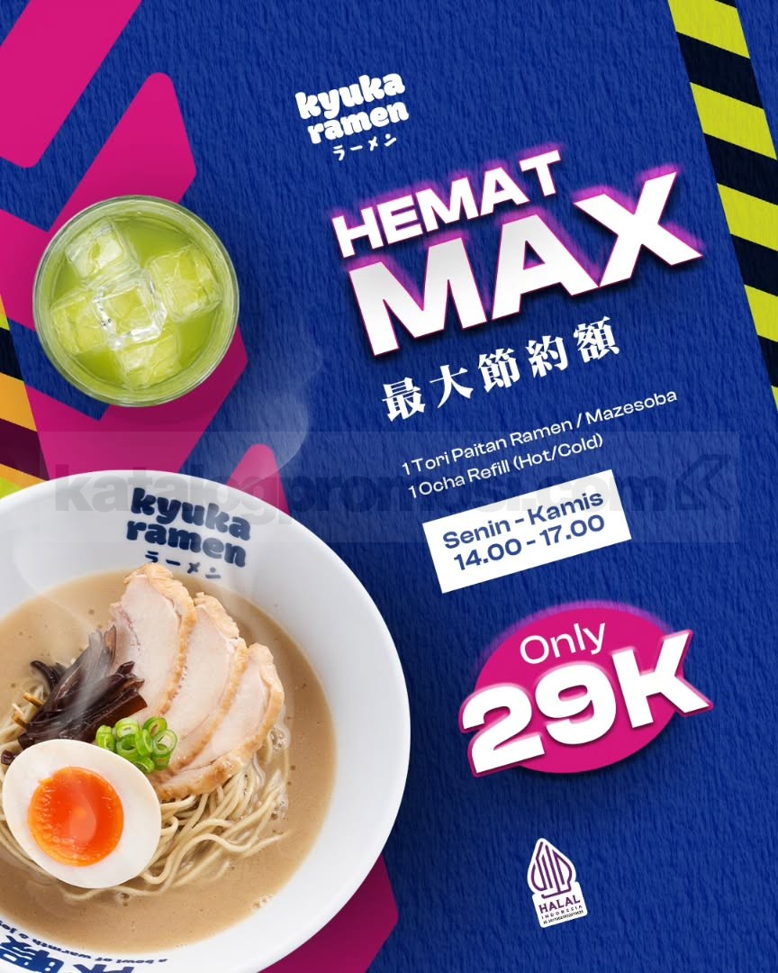 Promo digunakan melalui transaksi dine in di outlet Kyuka Ramen setiap Senin – Kamis pukul 14.00 – 17.00 dengan memilih paket Hemat Max berisi pilihan Tori Paitan Ramen atau Mazesoba serta 1 Ocha refill hot atau cold sesuai ketentuan program.