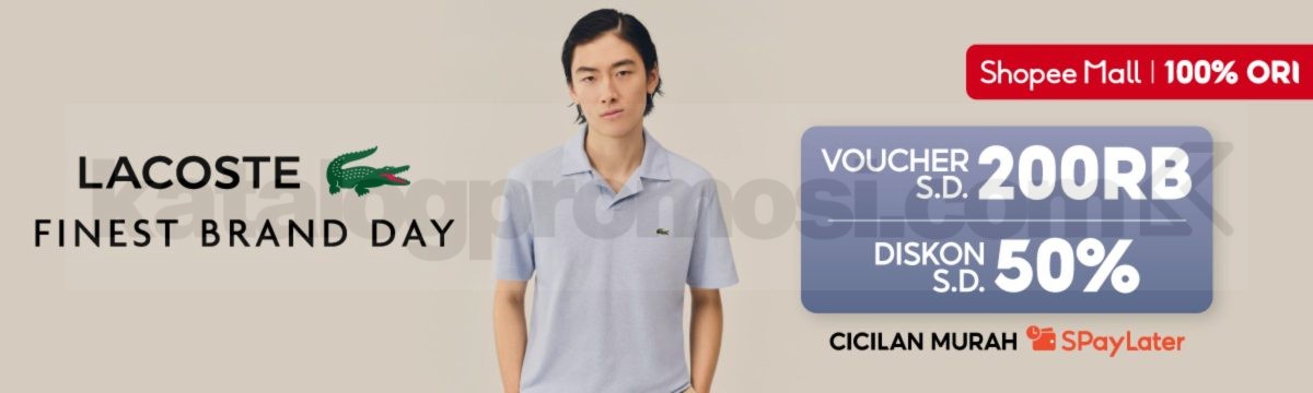 Promo Lacoste Finest Brand Day Diskon 50% dengan ekstra voucher hingga Rp. 200 ribu dan SPayLater berlaku 23 Februari 2026 di Shopee Mall.