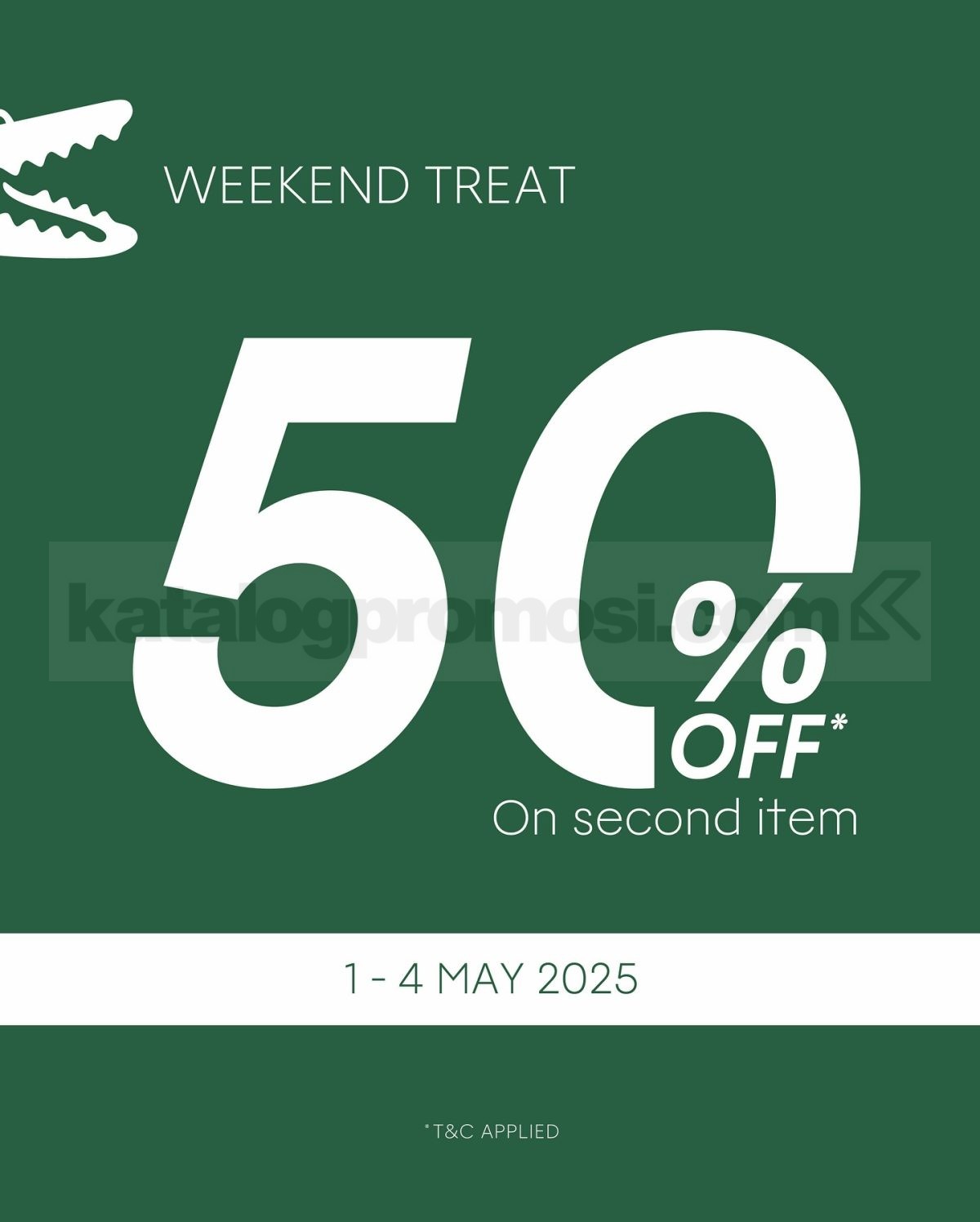 - Diskon hingga 50% berlaku pada produk Lacoste tertentu yang termasuk dalam program promo resmi.