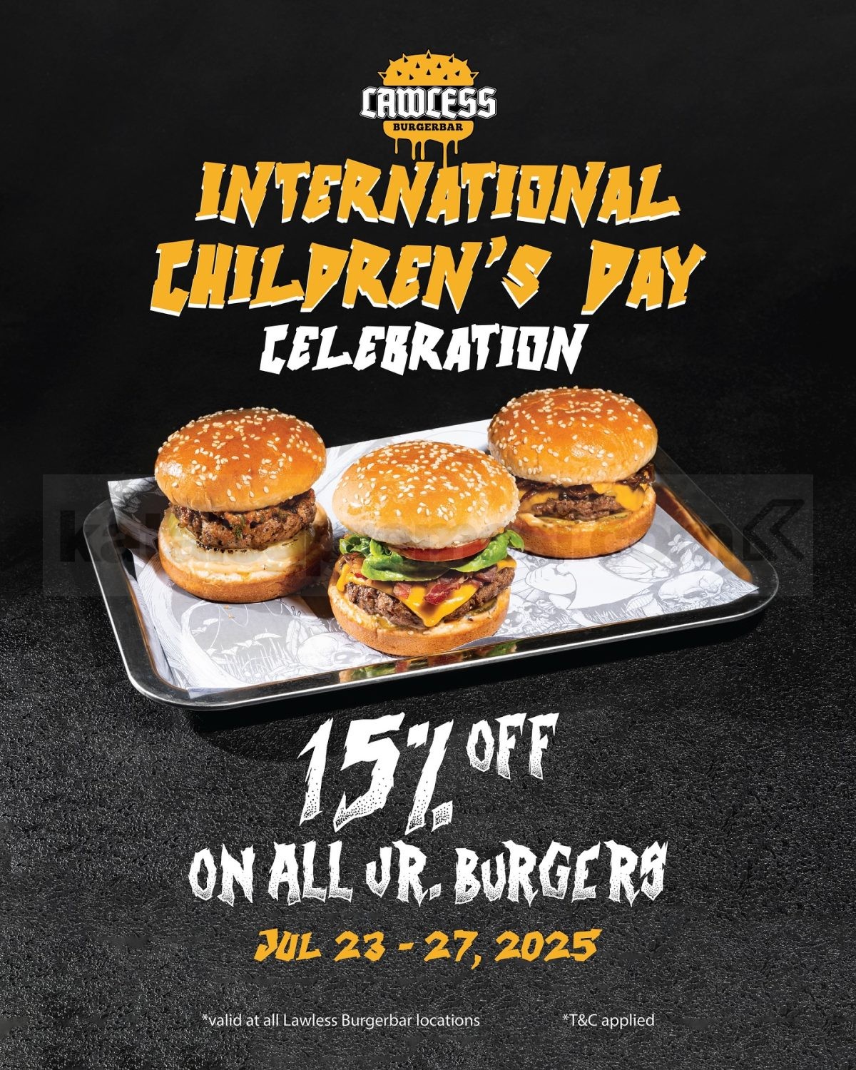 Promo Lawless Burgerbar Children’s Day! Diskon 15% untuk semua Jr. Burgers, berlaku di seluruh outlet mulai tanggal 23–27 Juli 2025. Yuk ajak si kecil makan bareng!