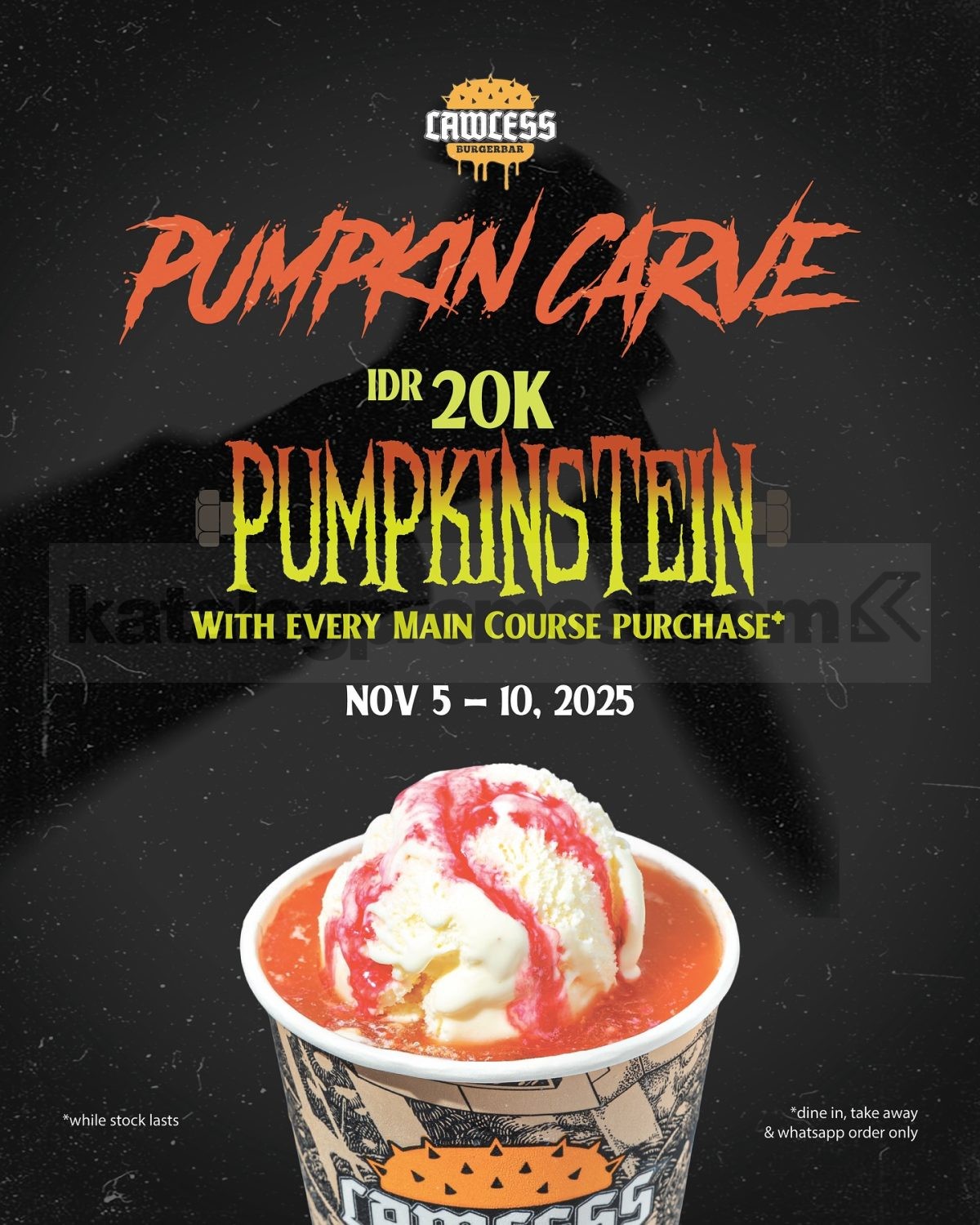 - Dapatkan Pumpkinstein Drink seharga Rp. 20.000 dengan pembelian 1 menu main course.