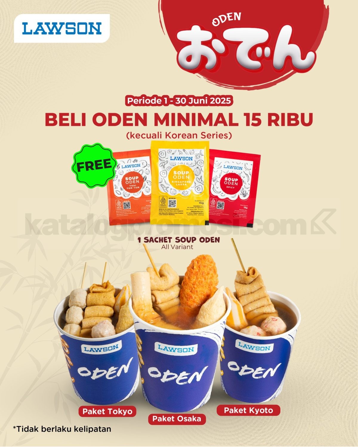 Promo Lawson beli Oden minimal Rp15000 (kecuali Korean Series) gratis 1 sachet Soup Oden semua varian! Hanya sampai 30 Juni 2025!