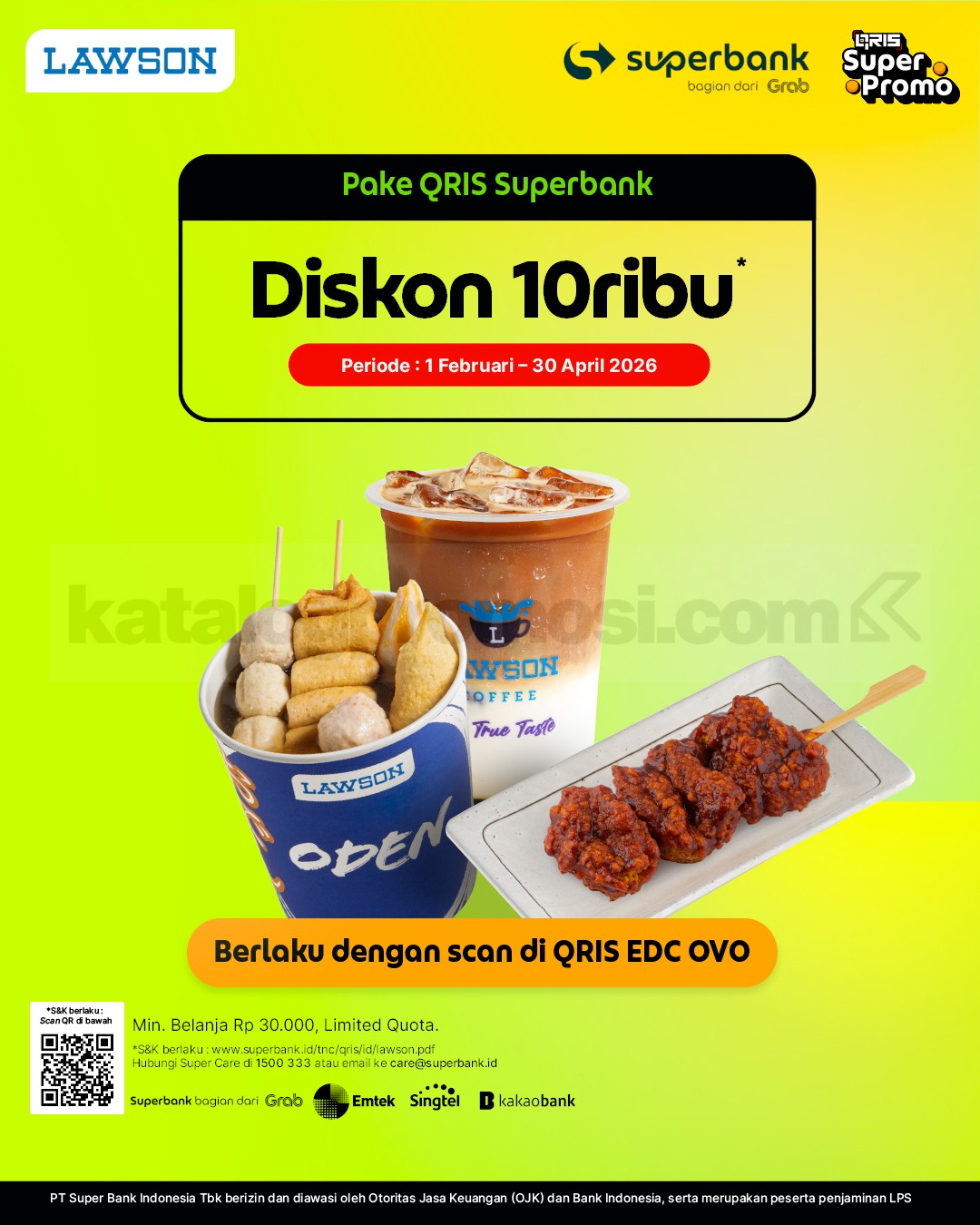 Promo Lawson Diskon Rp. 10.000 Pakai QRIS Superbank potongan Rp10.000 dengan scan QRIS EDC OVO min. transaksi Rp30.000 berlaku mulai tanggal 1 Februari 2026 – 30 April 2026.