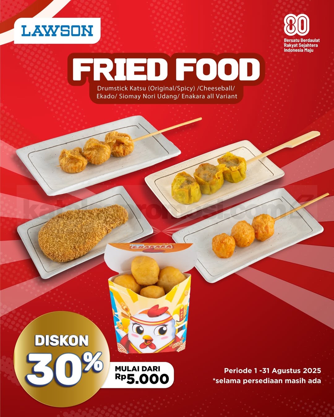 Promo Lawson Diskon 30% Fried Food hadir sepanjang Agustus 2025! Cuma Rp5.000 untuk camilan enak seperti Drumstick Katsu & lainnya.