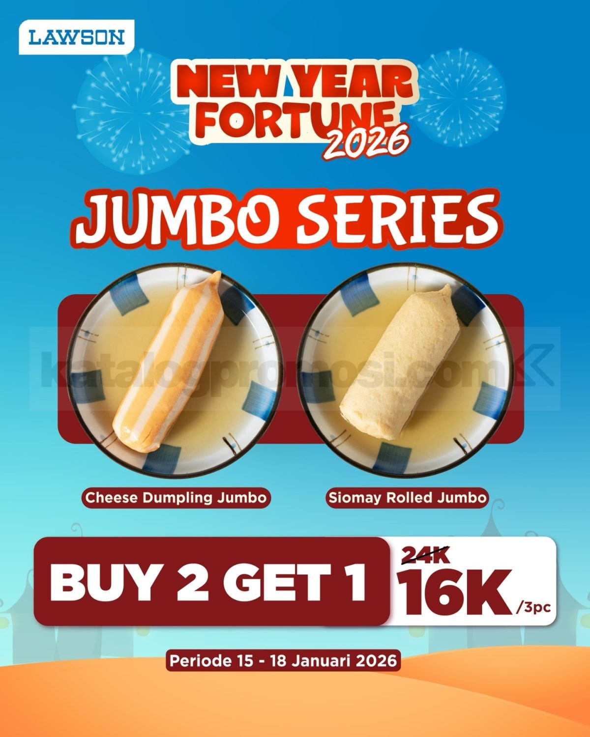 Promo Lawson Jumbo Series Buy 2 Get 1 cuma Rp. 16.000 untuk 3 pcs Cheese Dumpling Jumbo dan Siomay Rolled Jumbo, berlaku mulai tanggal 15–18 Januari 2026 di seluruh outlet Lawson