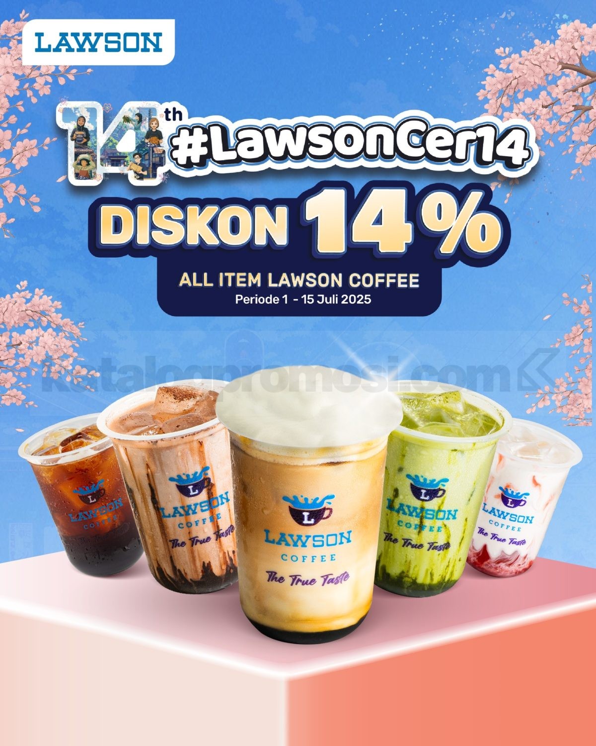 Promo Lawson #LawsonCer14 berlaku 1β15 Juli 2025! Diskon 14% buat semua item Lawson Coffee, buruan serbu ngopi hemat di Lawson terdekat