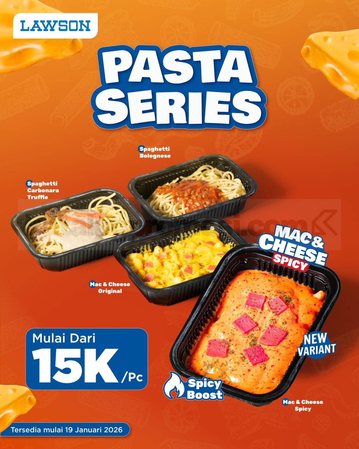 Promo Lawson NEW! Pasta Series mulai Rp. 15.000 dengan varian creamy, gurih, hingga pedas, termasuk Mac & Cheese Spicy, berlaku mulai 19 Januari 2026 di seluruh outlet Lawson.
