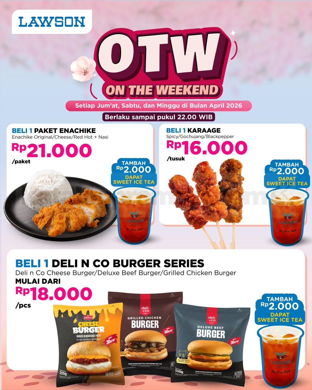 Promo Lawson OTW On The Weekend mulai Rp. 16.000 aneka menu favorit dengan harga spesial berlaku setiap jumat-minggu selama bulan April 2026 di seluruh outlet.