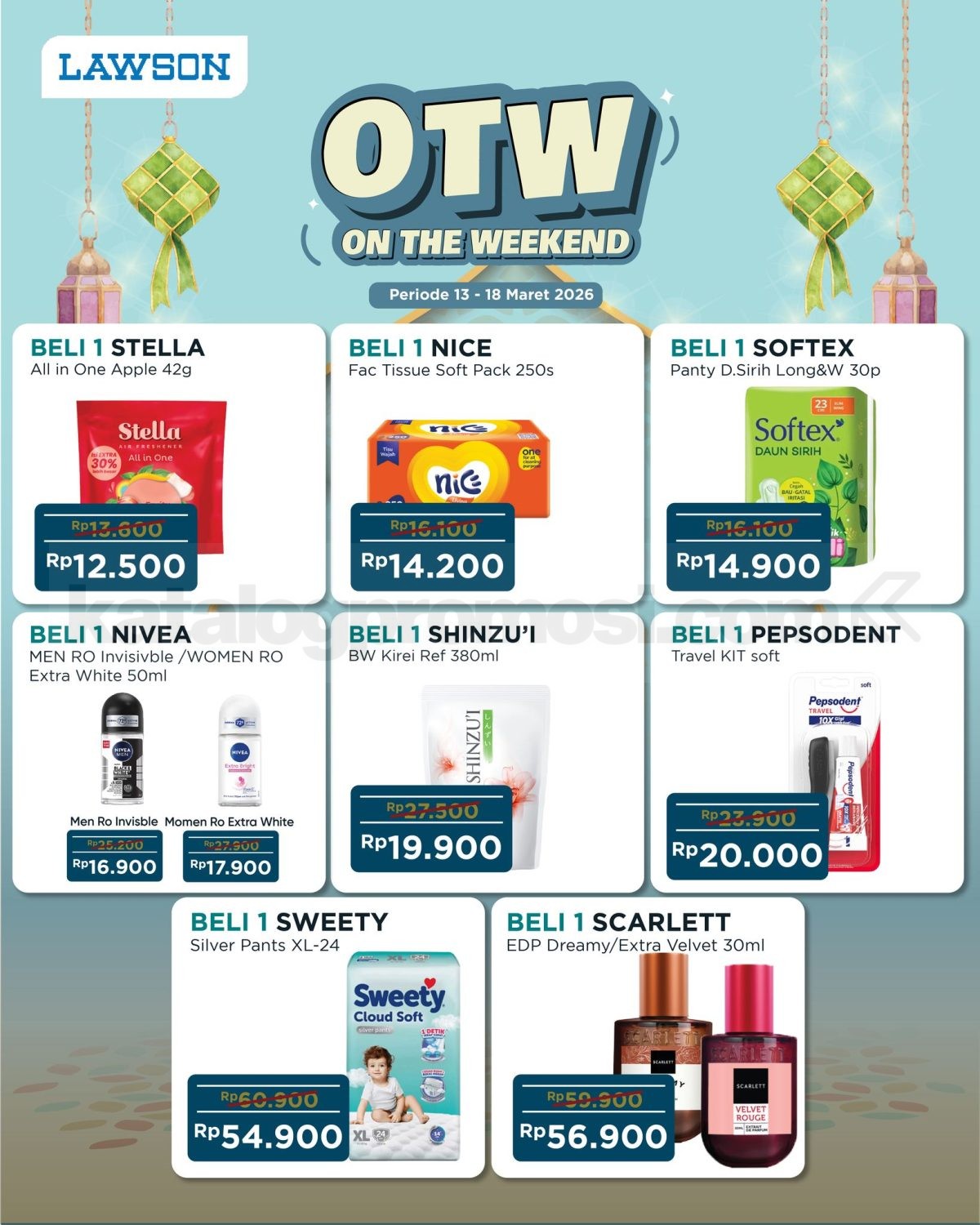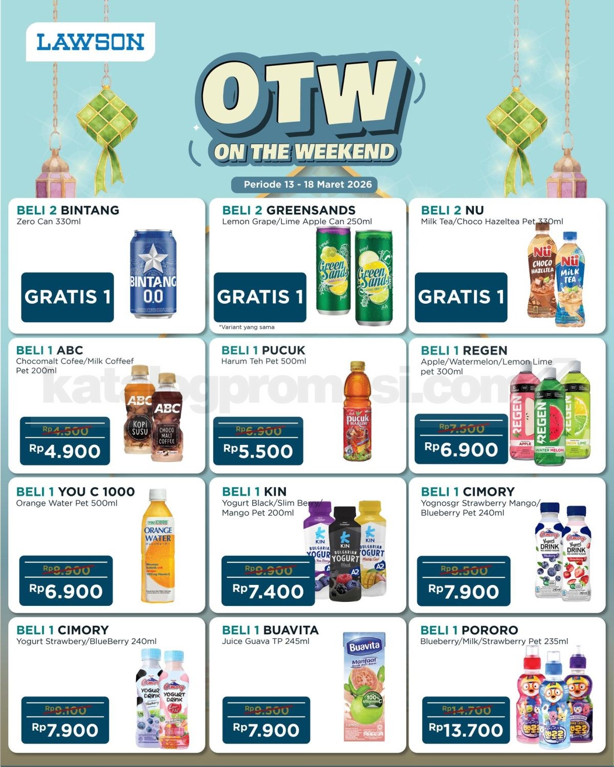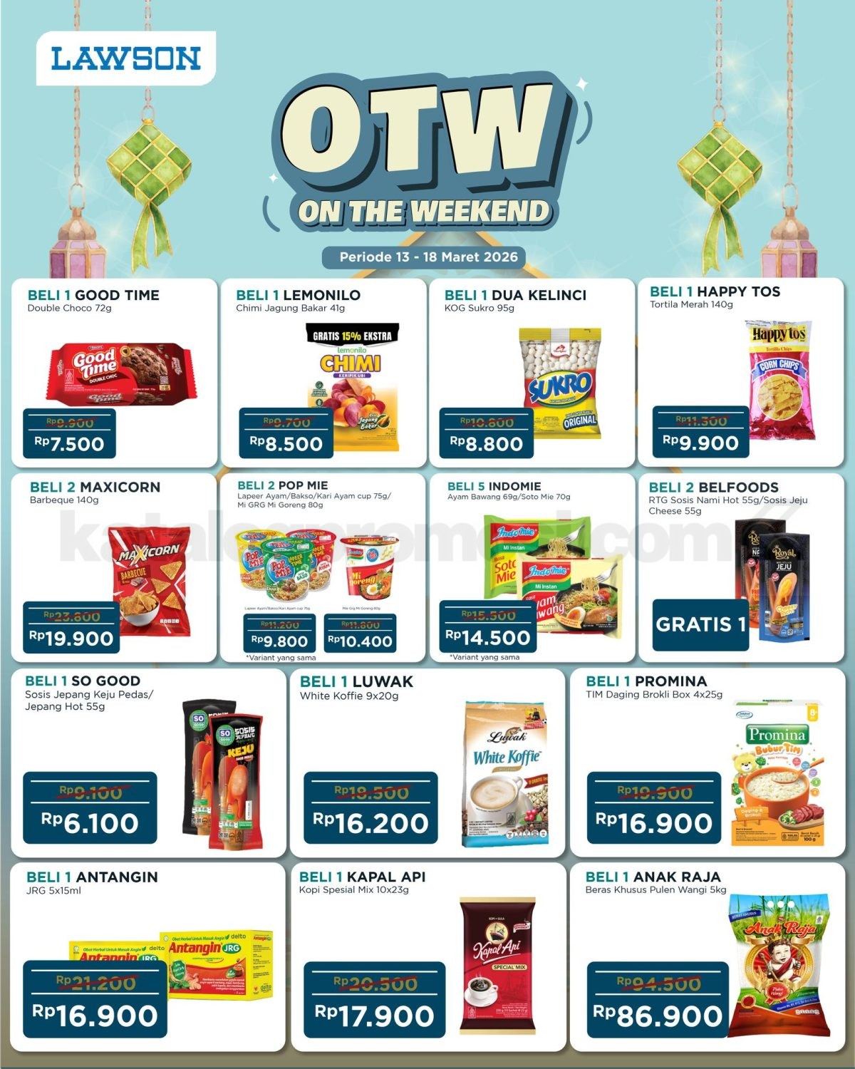 Promo Lawson OTW On The Weekend mulai Rp. 3.000 untuk minuman, snack, mie instan hingga produk harian berlaku mulai tanggal 13-18 Maret 2026 di outlet Lawson tertentu.