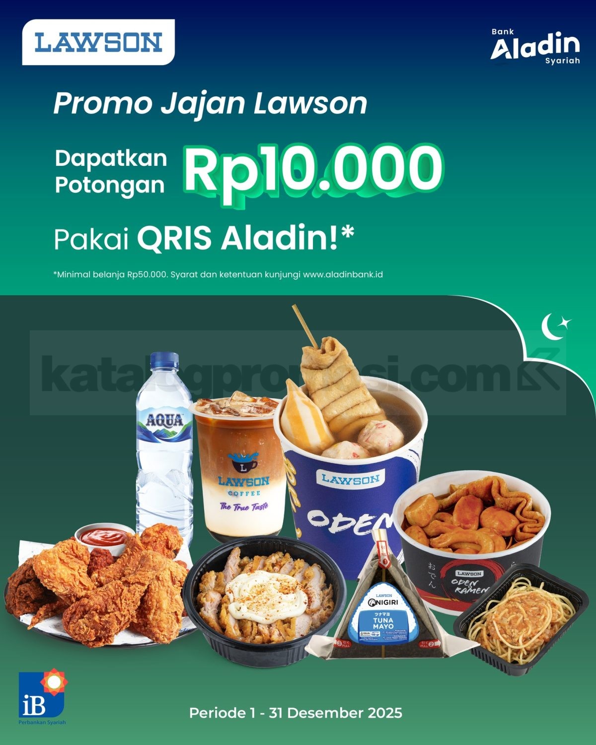Promo Lawson Potongan Rp.10.000 Pakai QRIS Aladin untuk transaksi minimal Rp50.000, berlaku 1β31 Desember 2025 di outlet Lawson lokasi tertentu.