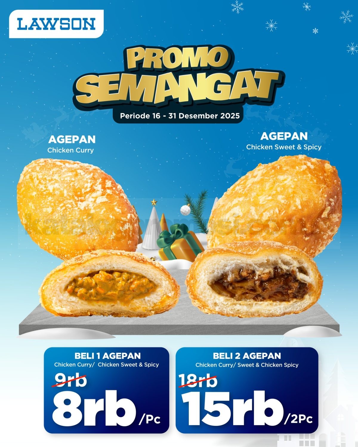 Promo LAWSON SEMANGAT mulai Rp. 8.000 untuk Agepan Chicken Chicken Curry dan Chicken Sweet & Spicy, berlaku tanggal 16 – 31 Desember 2025 di Lawson tertentu.