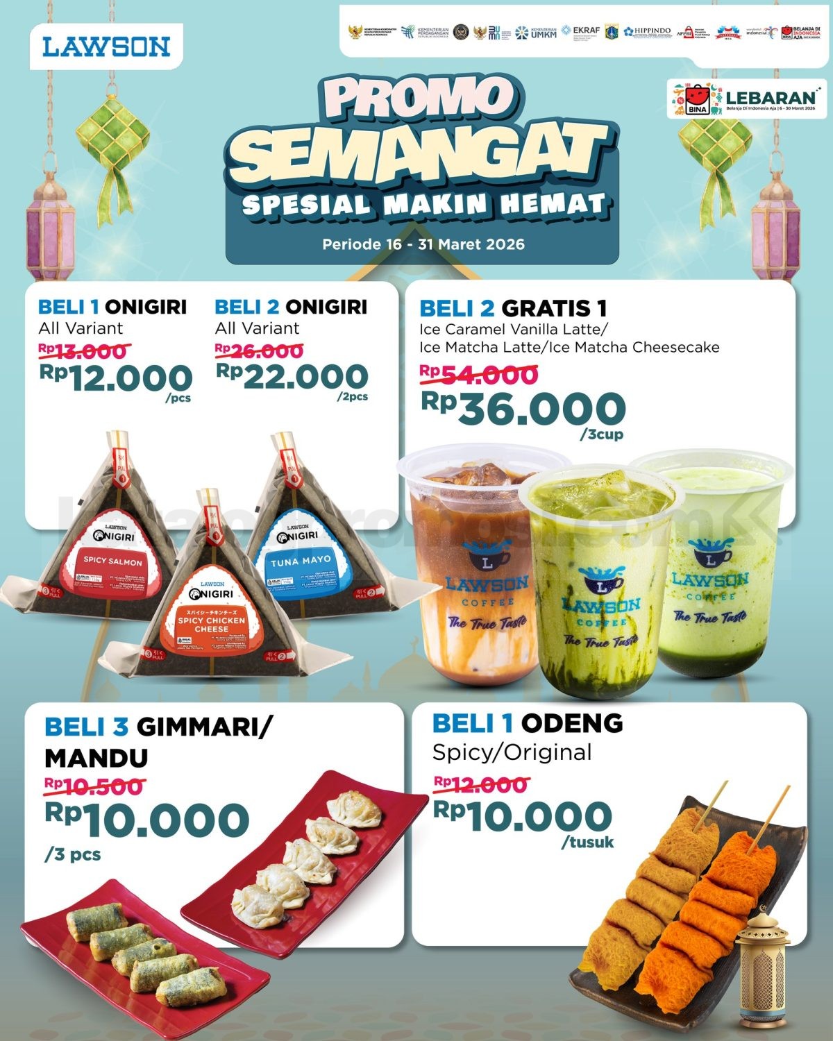 Promo Lawson Semangat Spesial Makin Hemat mulai Rp. 10.000 dengan pilihan onigiri, odeng, dan minuman latte berlaku mulai tanggal 16-31 Maret 2026 di outlet Lawson tertentu.