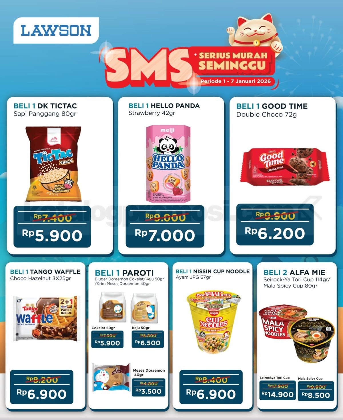 Promo Lawson SMS Serius Murah Seminggu dengan pilihan minuman, snack, mie instan, dan kebutuhan harian, berlaku mulai tanggal 01-07 Januari 2026 di outlet Lawson