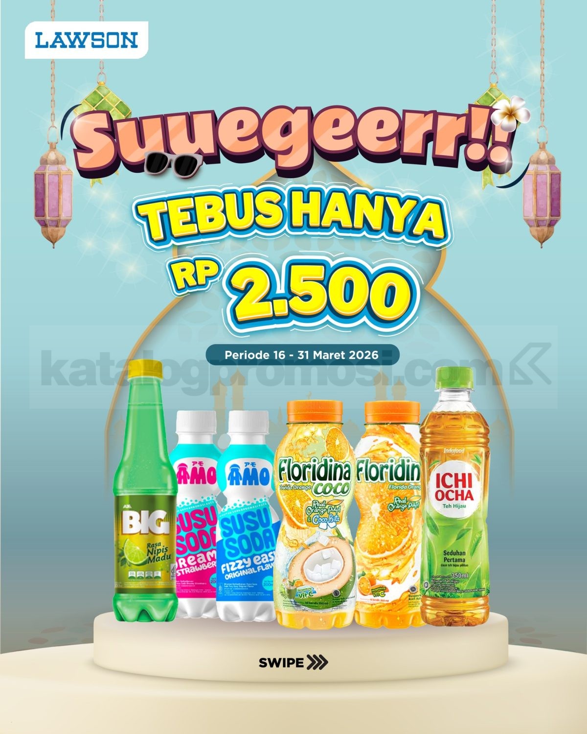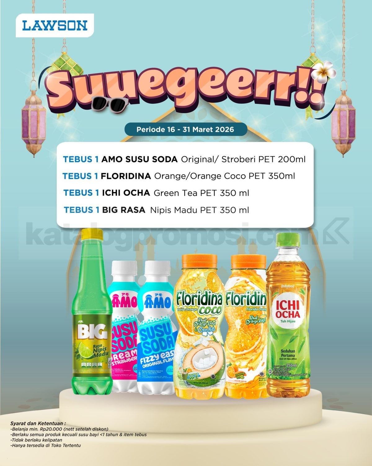 Promo Lawson Suegeerr Tebus Minuman Rp. 2.500 min belanja Rp20.000 berbagai minuman pilihan berlaku mulai tanggal 16 Maret 2026 – 31 Maret 2026 di seluruh outlet.