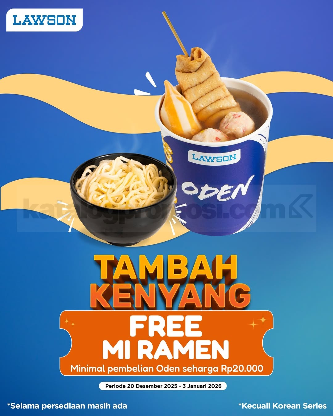 Promo Lawson Tambah Kenyang beli oden minimal Rp. 20.000 gratis mie ramen, berlaku 20 Desember 2025 – 3 Januari 2026 di semua Lawson.