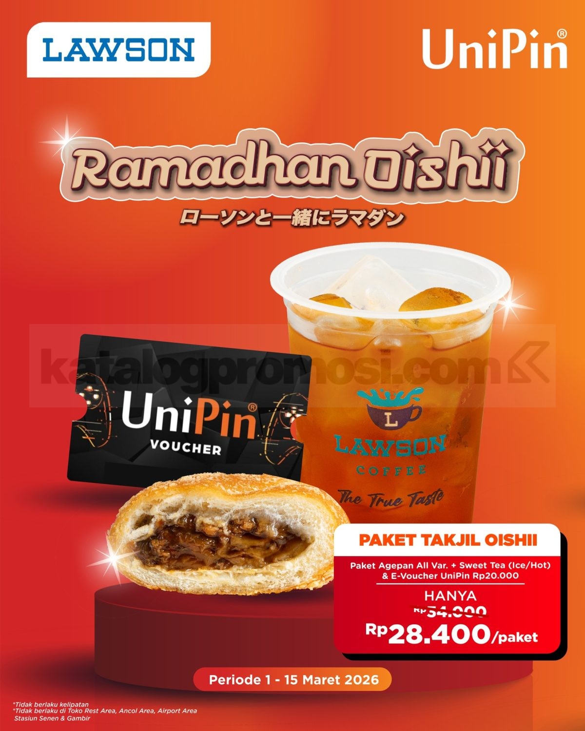 Promo Lawson UniPin Paket Takjil Oishii Rp. 28.400 paket Agepan + Sweet Tea & E-Voucher UniPin Rp. 20.000, berlaku mulai tanggal 1 Maret 2026 – 15 Maret 2026 di seluruh outlet.