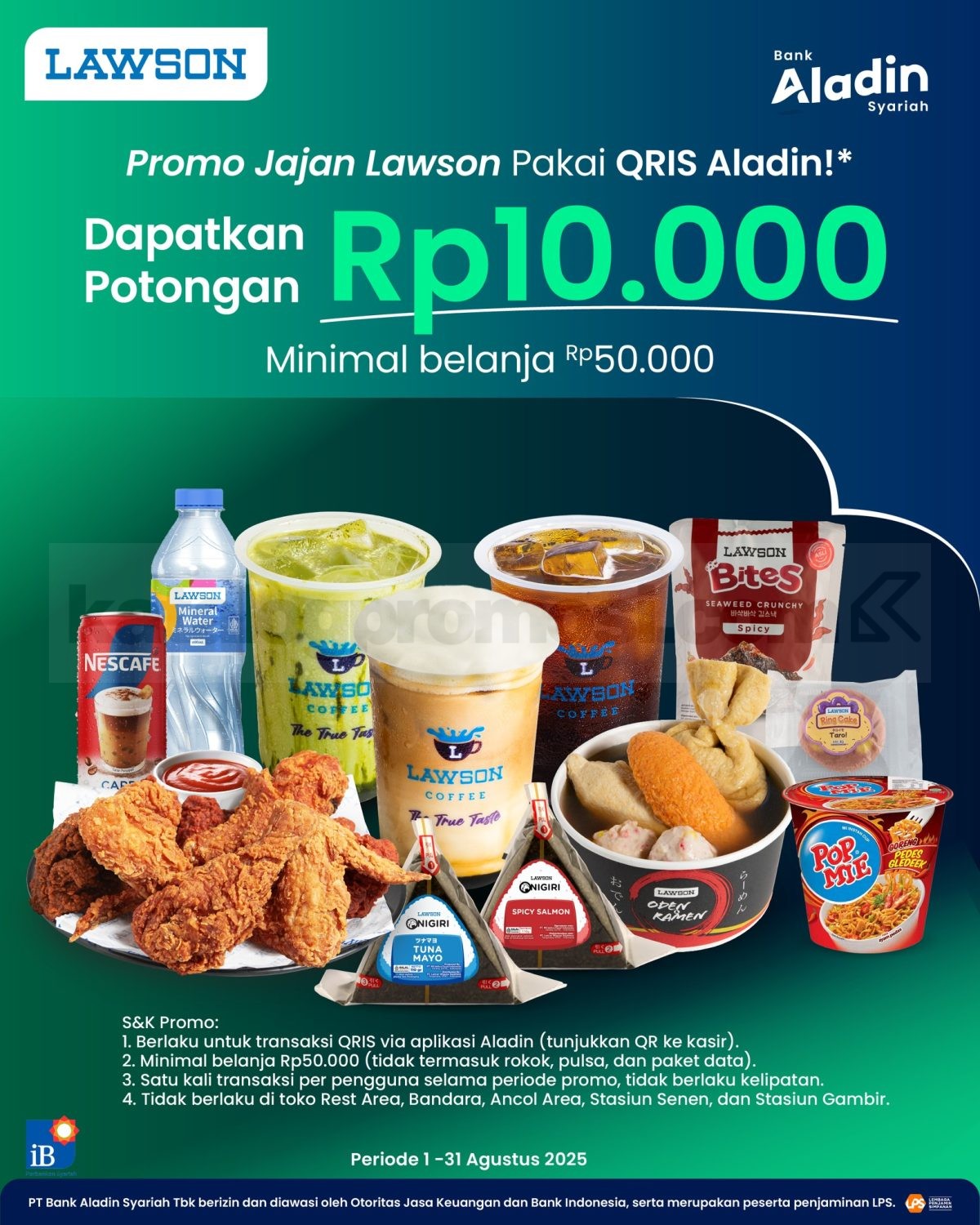 Promo Lawson Potongan Rp.10.000 Pakai QRIS Aladin untuk transaksi minimal Rp50.000, berlaku 1–31 Desember 2025 di outlet Lawson lokasi tertentu.