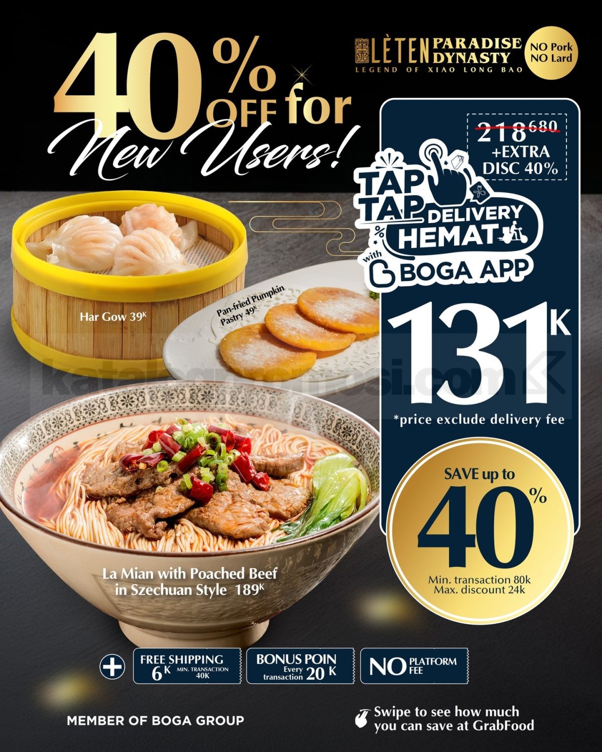 Promo Leten Paradise Dynasty Delivery Diskon hingga 40% ini memberikan kemudahan menikmati menu favorit langsung dari rumah lewat berbagai platform delivery. Kamu bisa memilih aplikasi favorit seperti BOGA App, GoFood, atau GrabFood dengan penawaran diskon yang berbeda, tapi tetap menguntungkan.