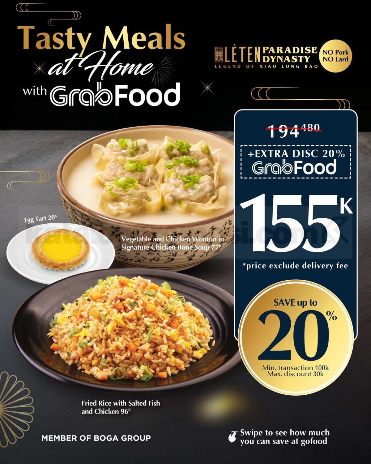 Promo Leten Paradise Dynasty Delivery Diskon hingga 40% dengan menu set Rp. 60.000 via aplikasi berlaku selama periode promo di lokasi tertentu.