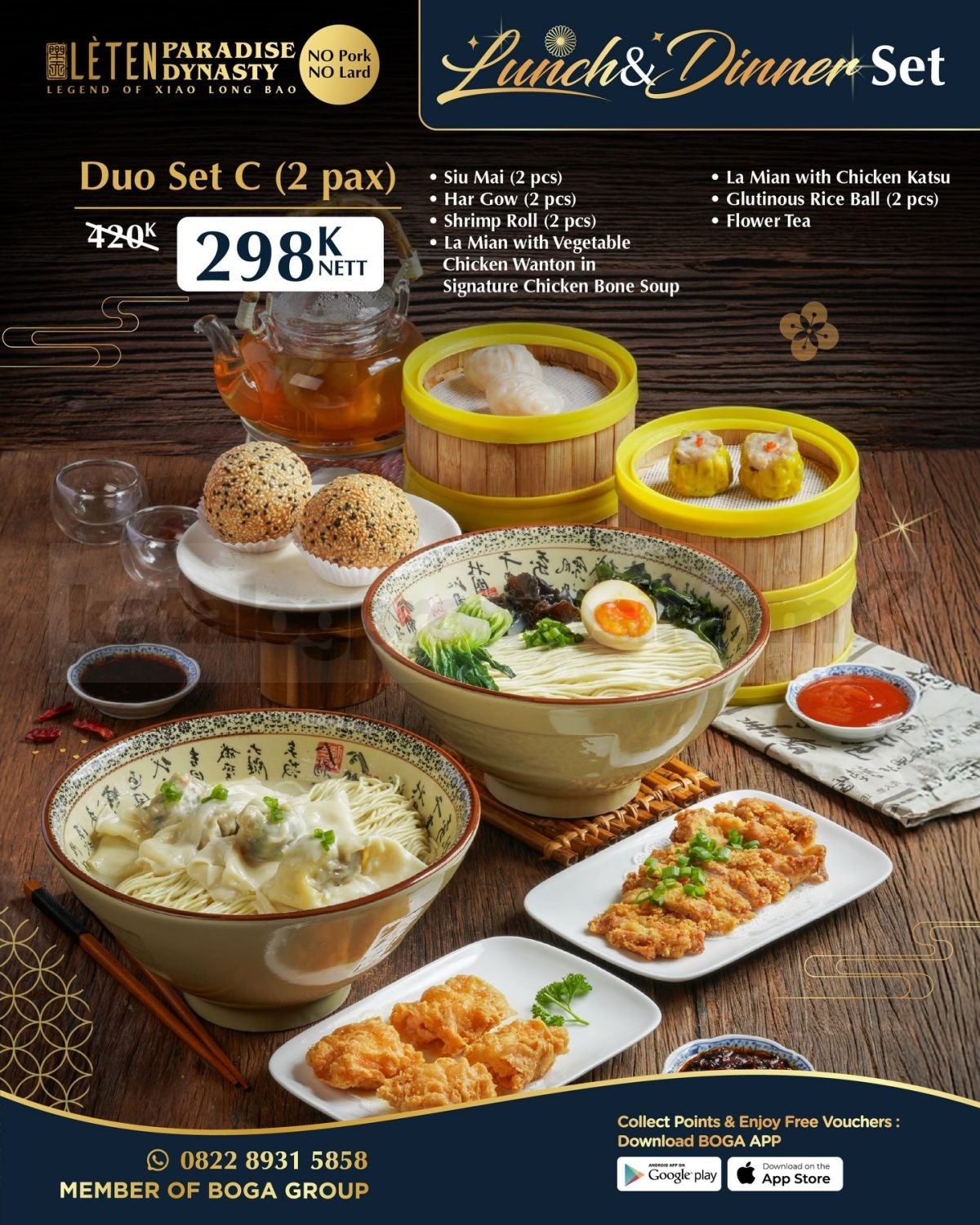 Promo Leten Paradise Dynasty Duo Set Lunch & Dinner harga paket makan berdua mulai Rp. 114.000 per orang, menu lengkap, berlaku di outlet tertentu.