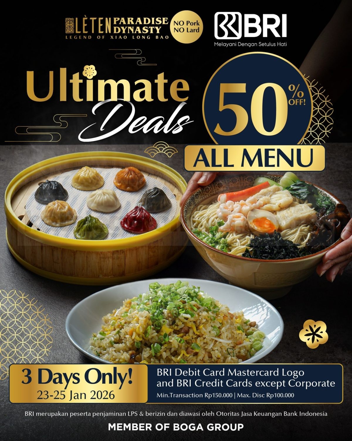 Promo Lèten Paradise Dynasty Ultimate Deals Diskon 50% all menu dengan pembayaran Kartu BRI, minimum transaksi Rp150.000, berlaku mulai tanggal 23-25 Januari 2026.